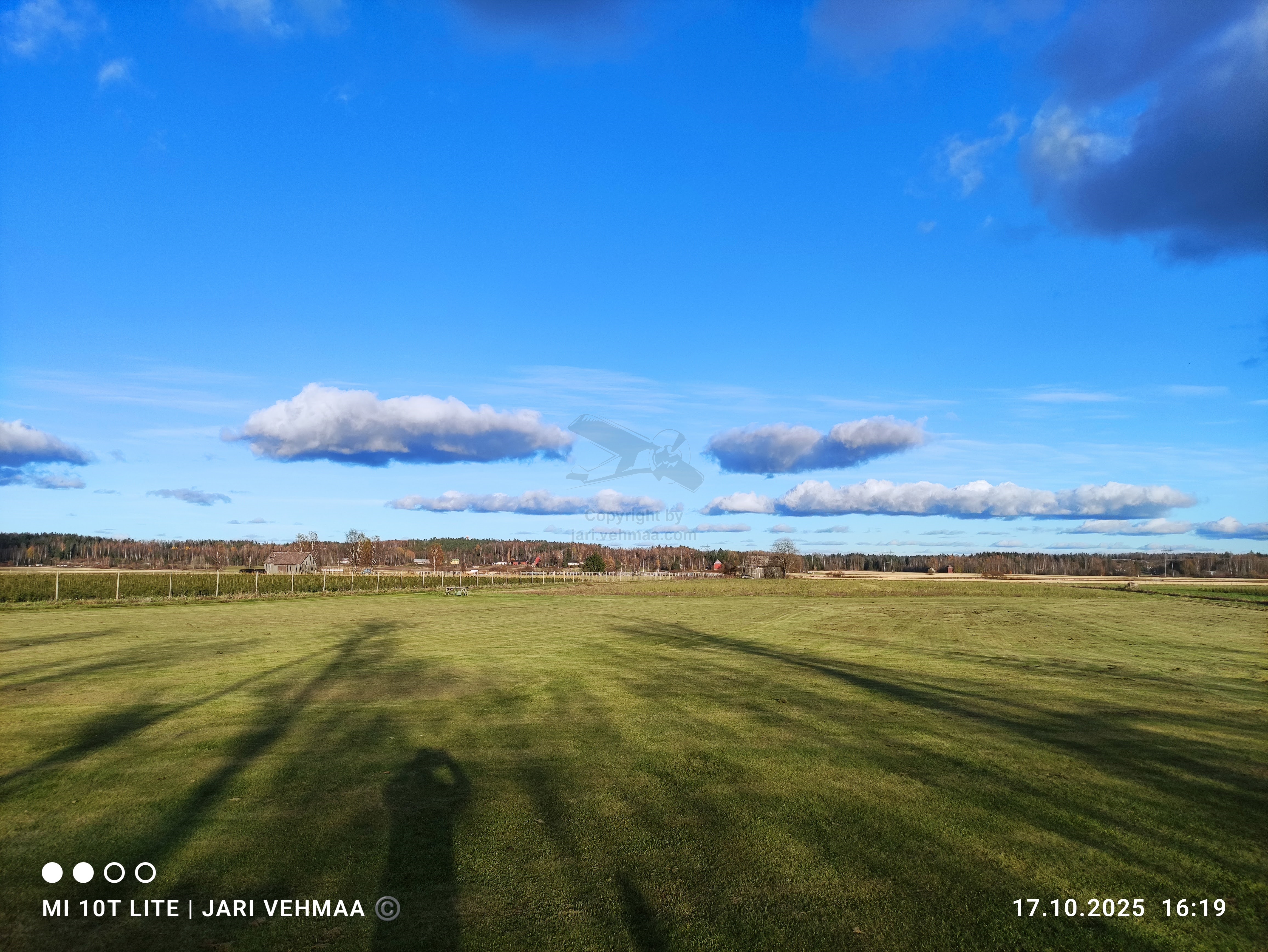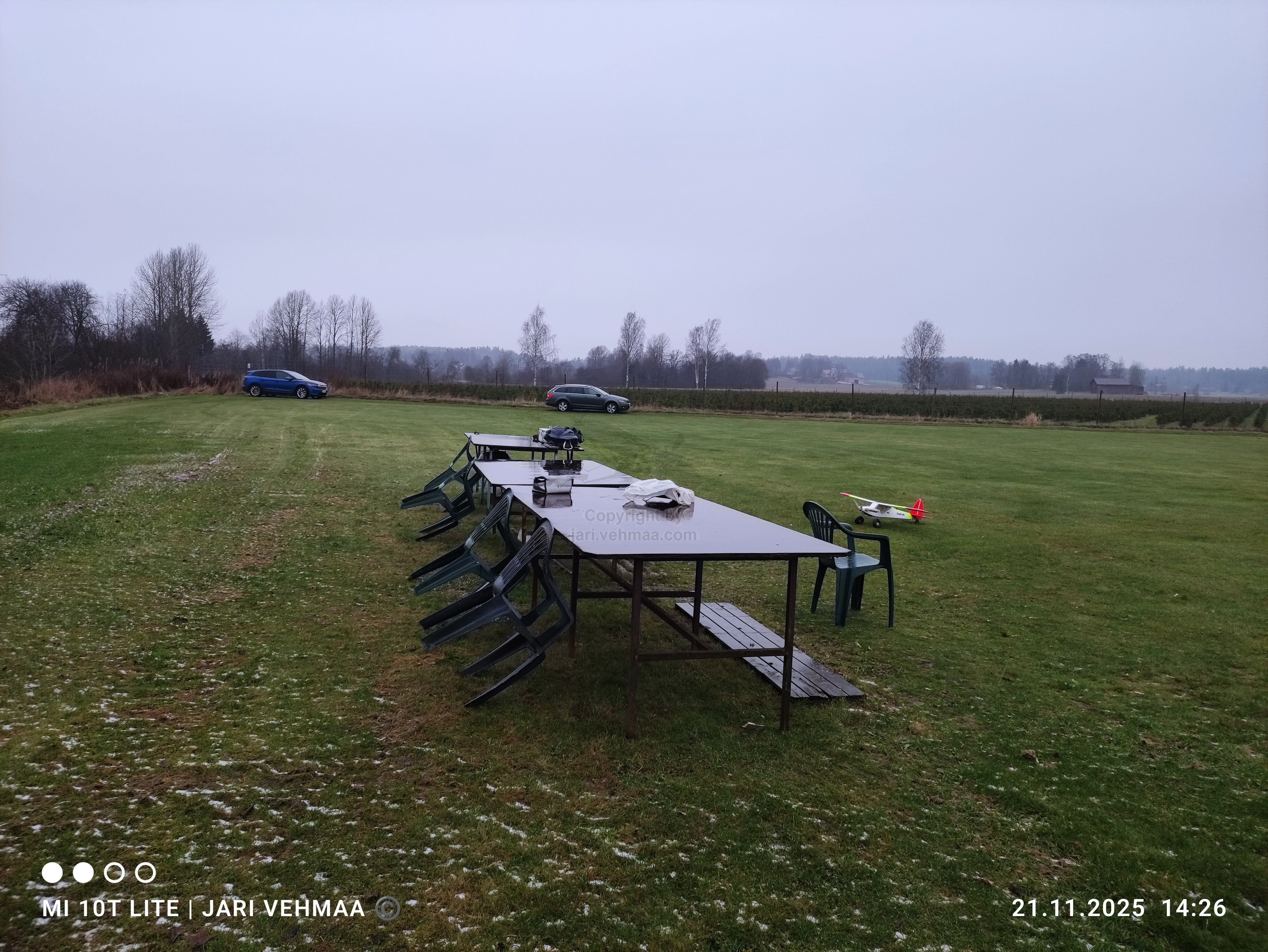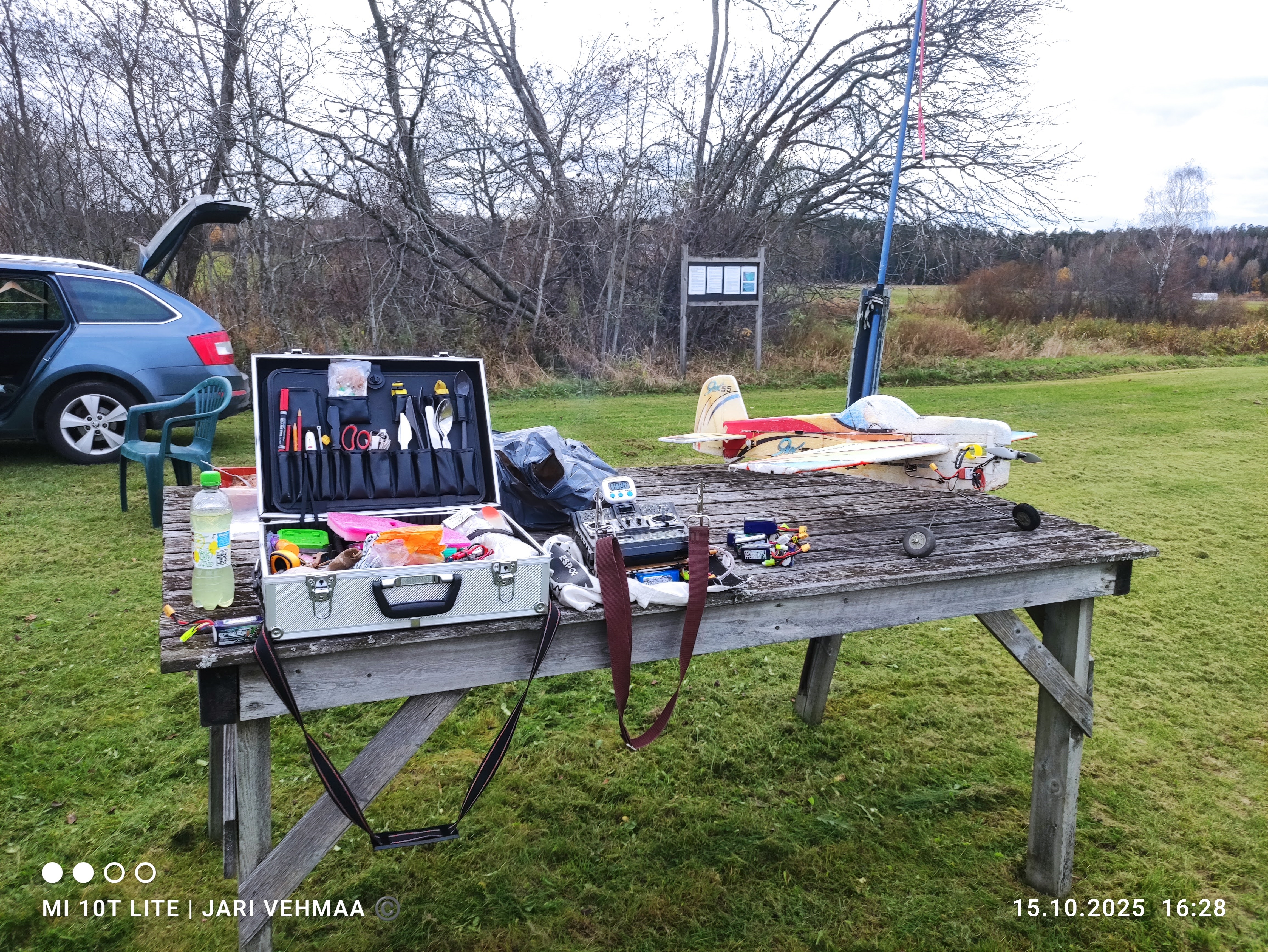 Ehdin perille jo hieman kolmen jälkeen. Paikalla puhalteli vielä tässä vaiheessa kevyt tuulenvire, joka ei kuitenkaan haitannut lennättämistä. Viime lauantaina kentän pinnalla ollut runsas ruohosilppu oli kuivunut lähes olemattomiin. Ilmassa alkoi jo tuntua tulevan talven lähestyminen – kalsa ilma ja kentän yli liitävät suuret hanhiparvet muuttoauramuodostelmissaan.