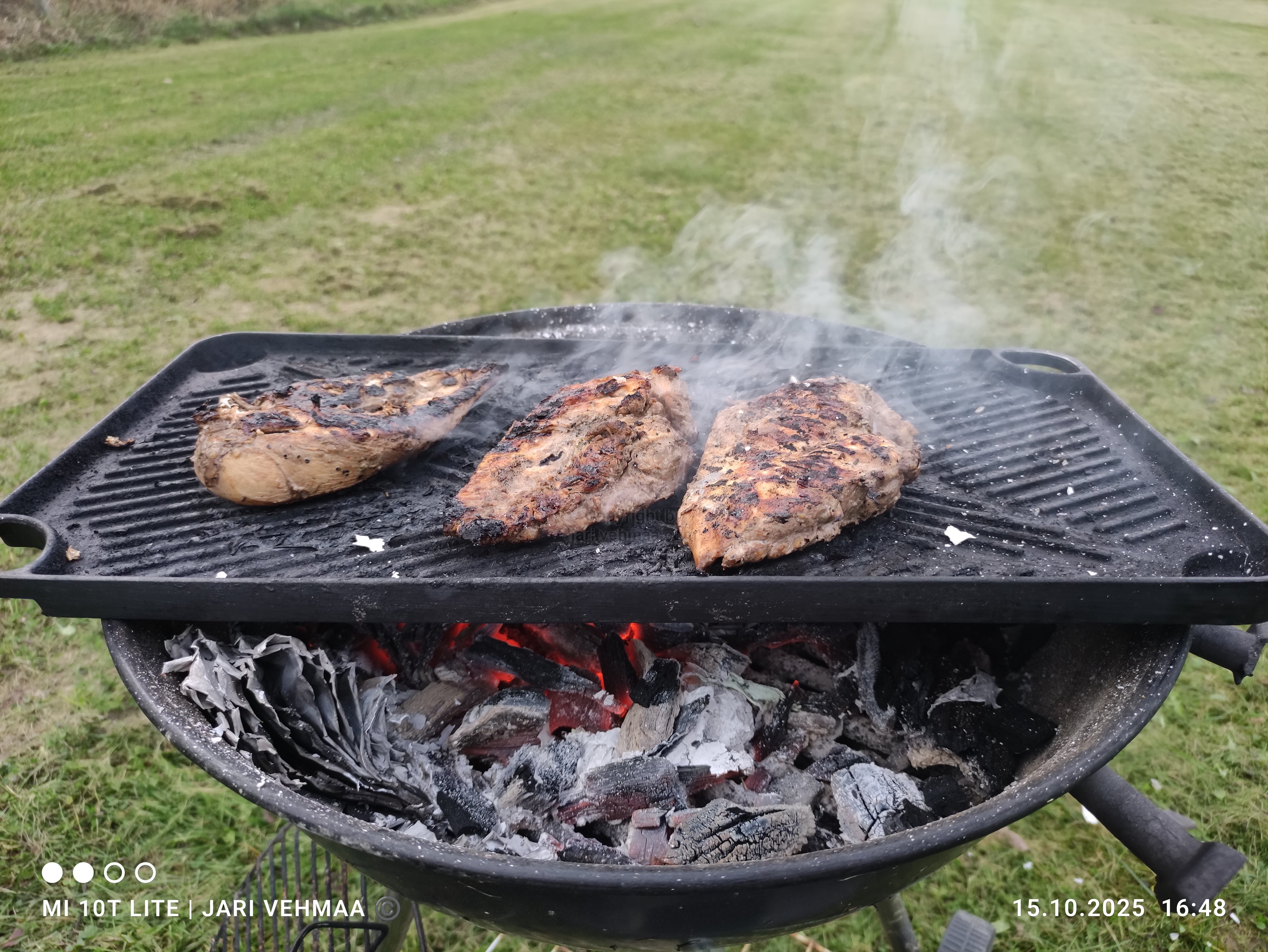 Säänhaltija asetti omat haasteensa maittavan ja ravitsevan kenttälounaan suhteen. Ensimmäinen yritys kilpistyi siihen, kun vesi lainehti arinalla. Vesi veks ja grilli laitettiin uudelleen tulille. Tällä kertaa porsaan grillefileet saatiin valmistettua loppuun asti, mutta ukkoskuuron saattelemana ateria piti nauttia autossa rakeiden ropinan lomassa. Tässä vaiheessa niin mies kuin kalusto oli jo sen verran läpimärkää, että katsoin parhaaksi lopettaa tämän päivän osalta, vaikka iso läjä akkuja jäi vielä ajamatta.