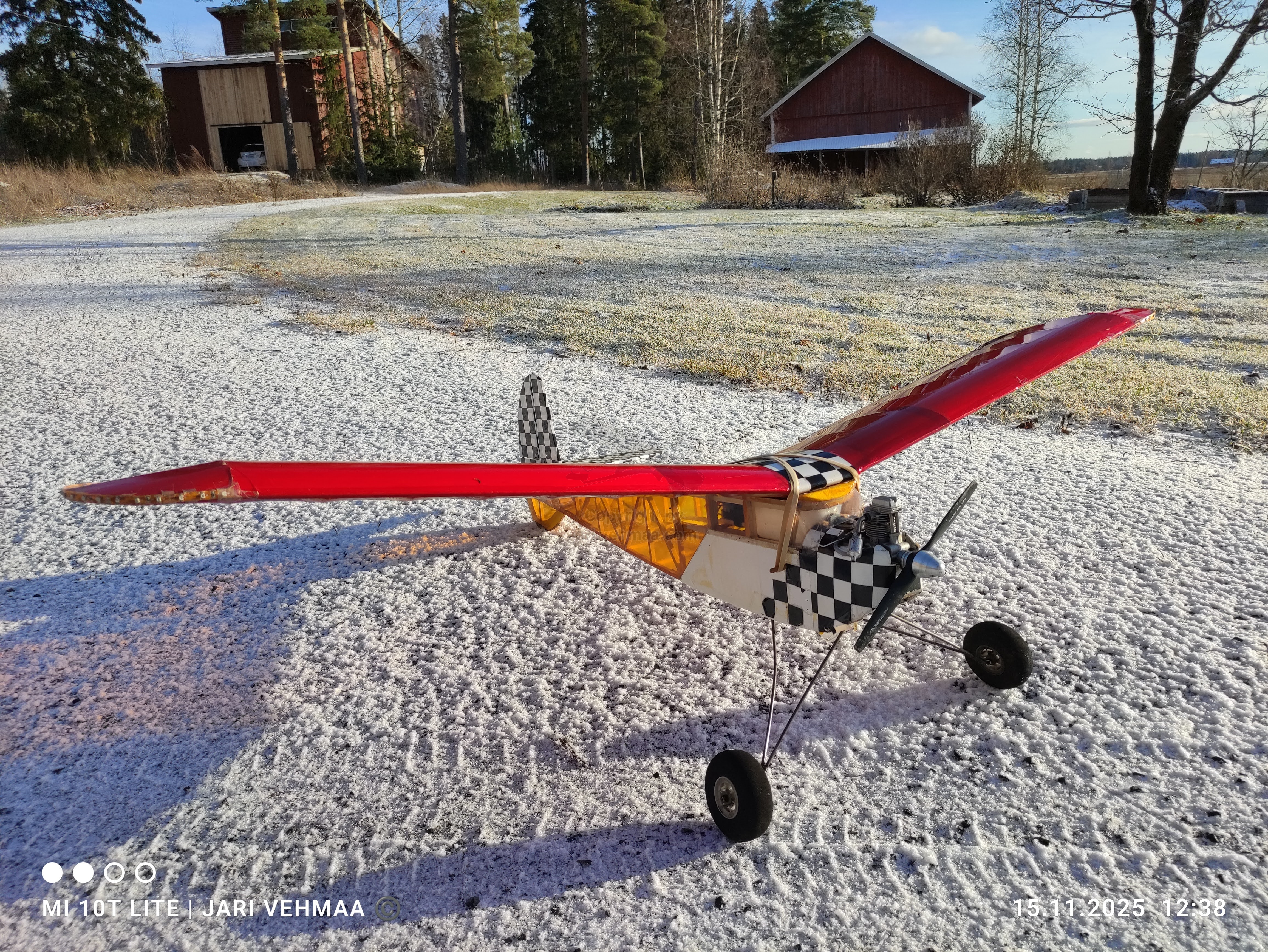 Ensimmäinen Junnun lento jäin ihan kanan lennoksi moottorin sammuessa aika pian heittolähdön jälkeen. Uuden käynnistysyrityksen yhteydessä säädin moottoria, niin johan alkoi Pikku-Ossi käydä ja kukkua. Tyynessä kelissä, talven ensimmäisillä pakkasilla, moottori käydä pörisi 22’33” ja pienen liitelyn jälkeen lentoajaksi tuli 23’35”.