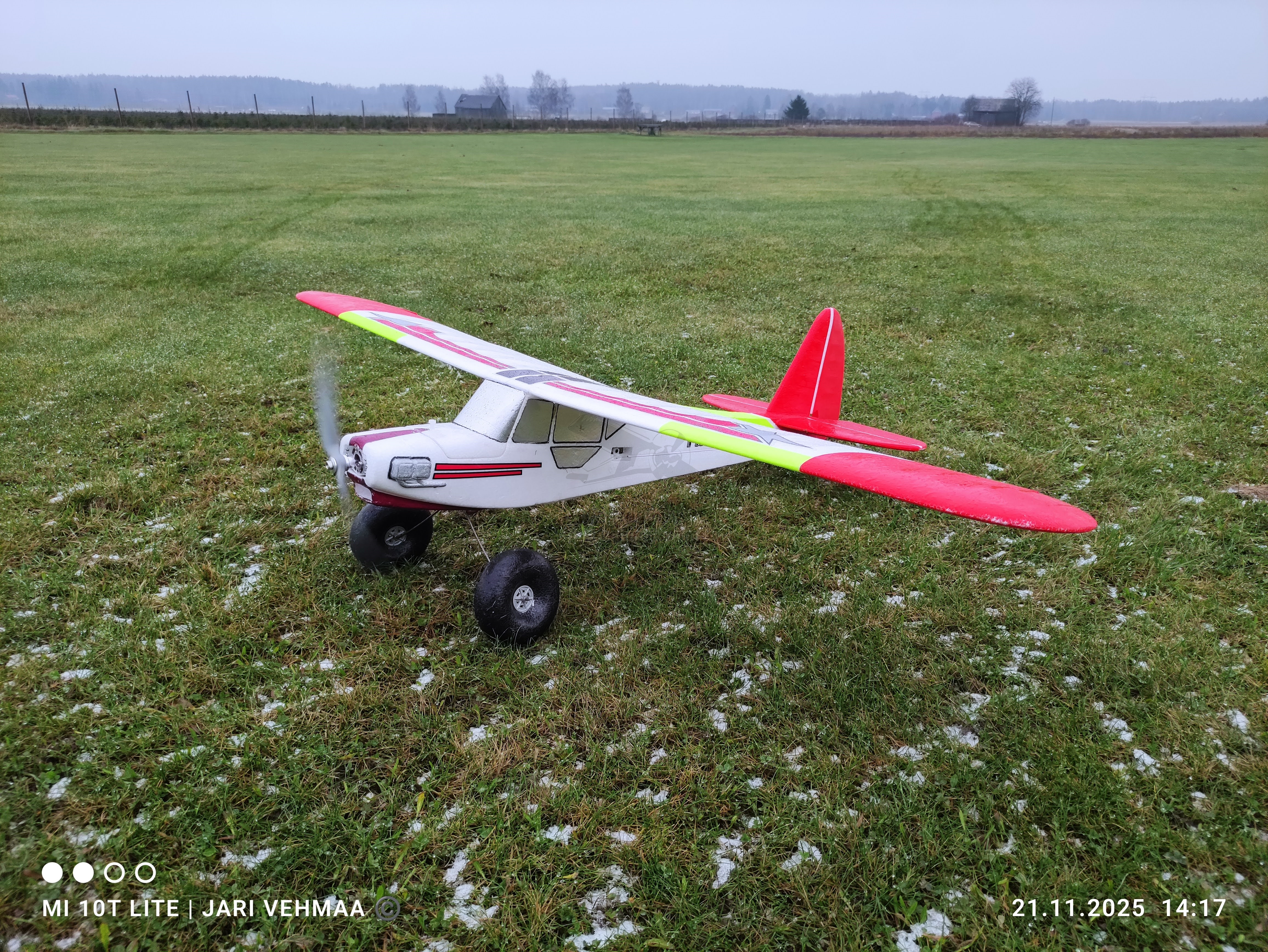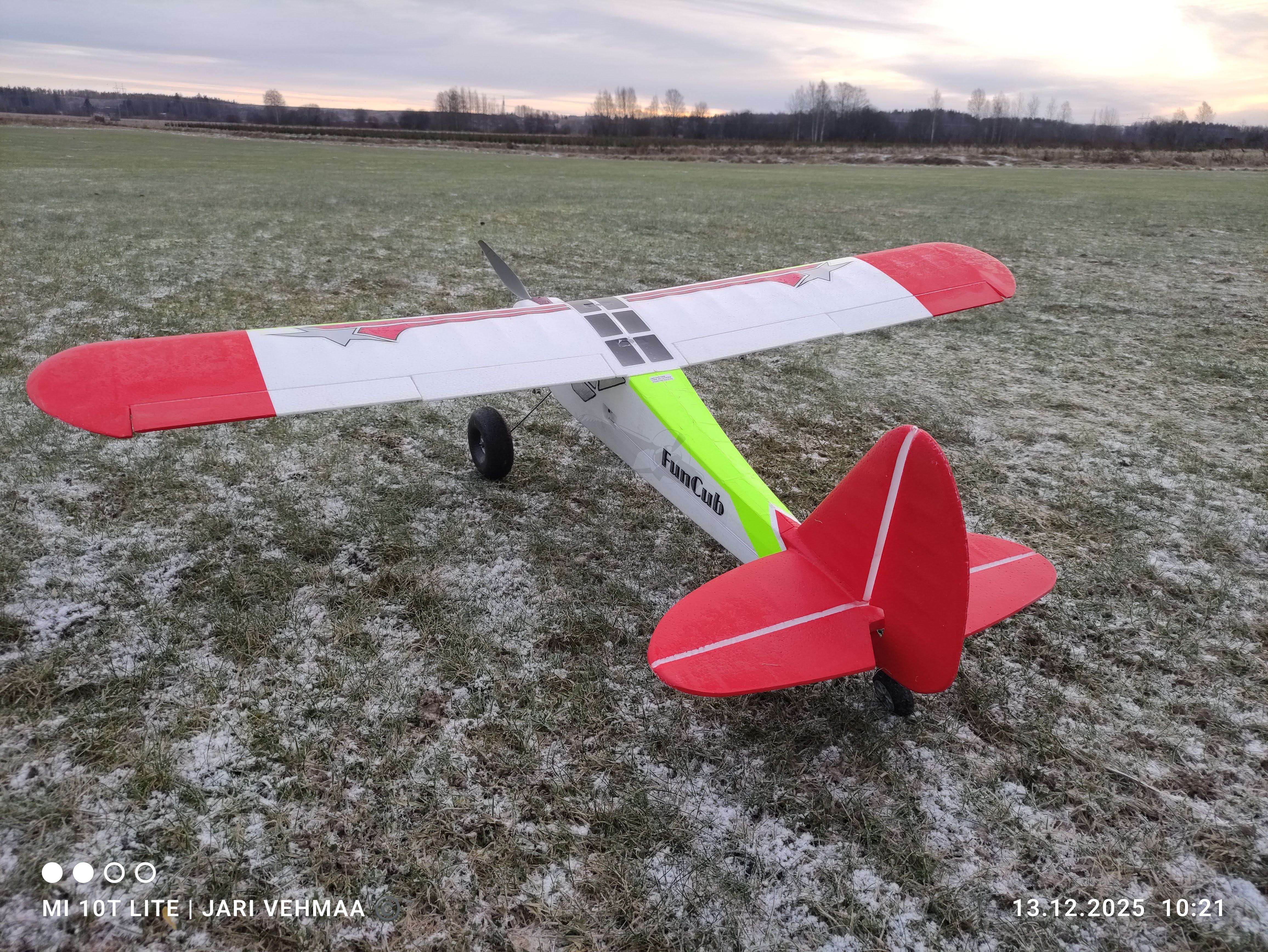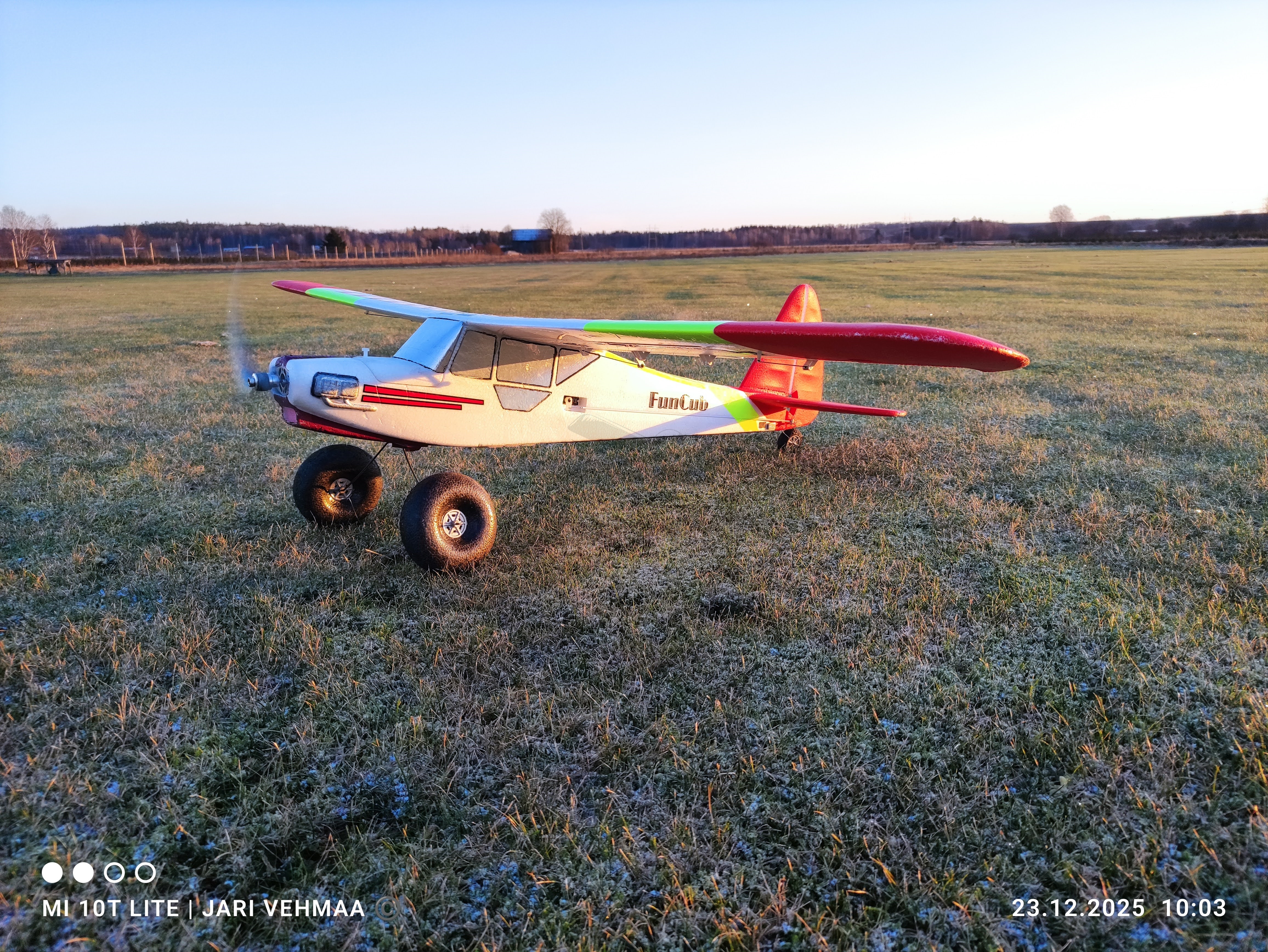 FunCup oli saanut alleen Hobby Kunkun nokkapyöräsukset, jotka paljastuivat liian pieniksi, eikä kone päässyt niillä ilmaan. Vastaavasti laskussa sukset eivät kannatelleet konetta puuterilumessa. Ehdin lennättää Vesaa odotellessa parit 3s2650 mAh Zippy-lahjoitusakut, joilla tuli tiimaa seuraavasti; 8'39" ja 9'37", mikä oli todella mukavasti ties miten vanhoille akuille.