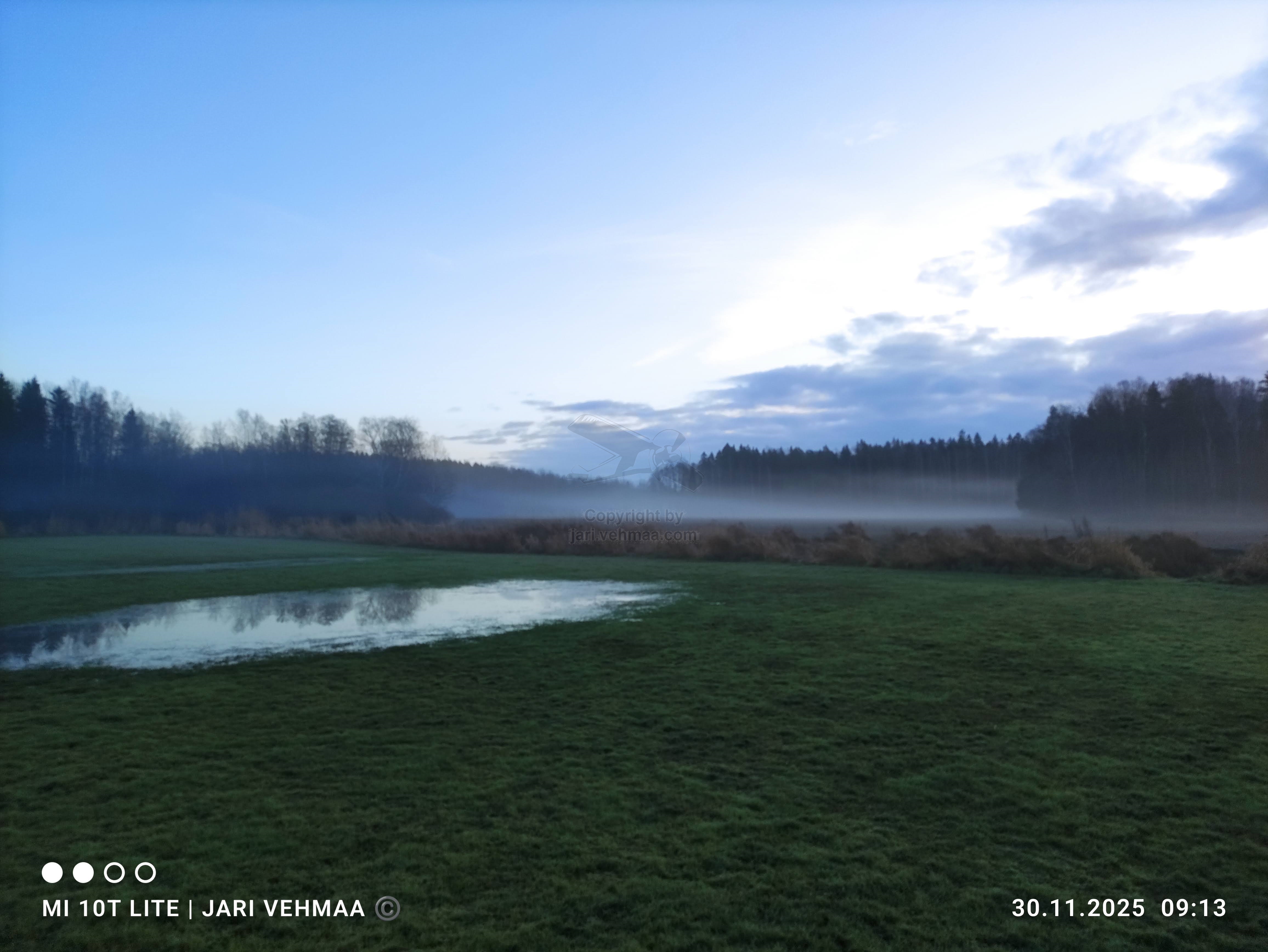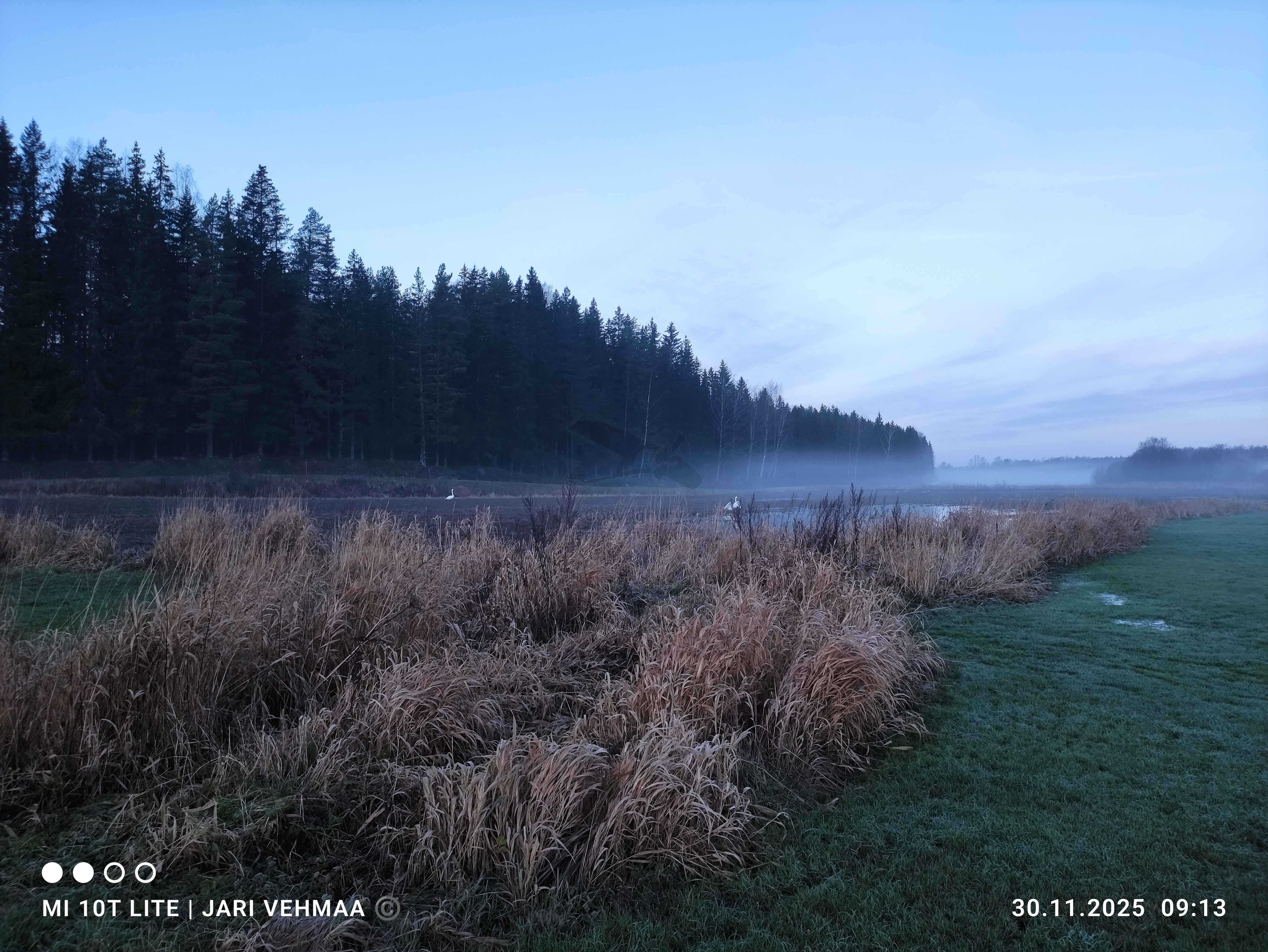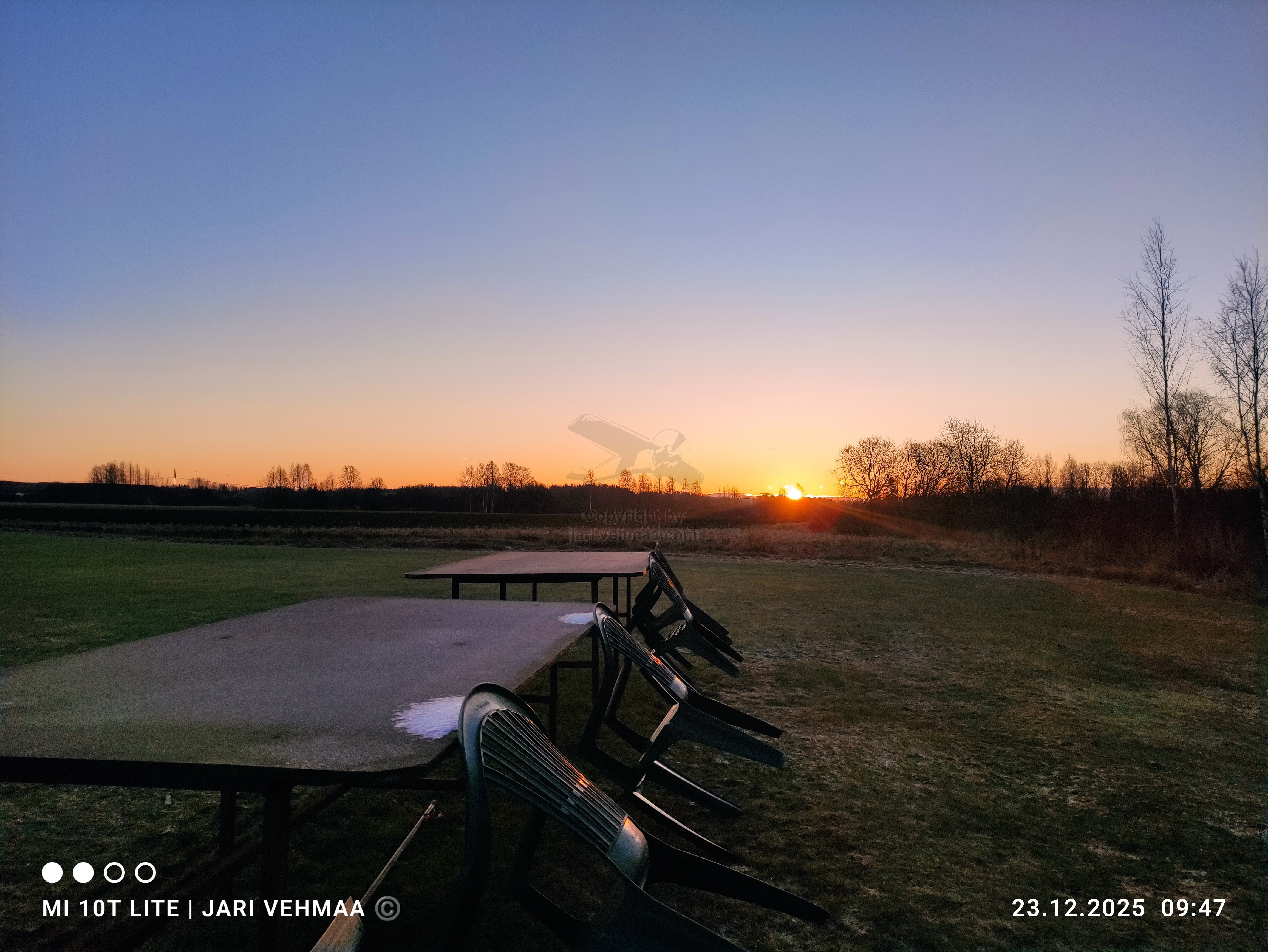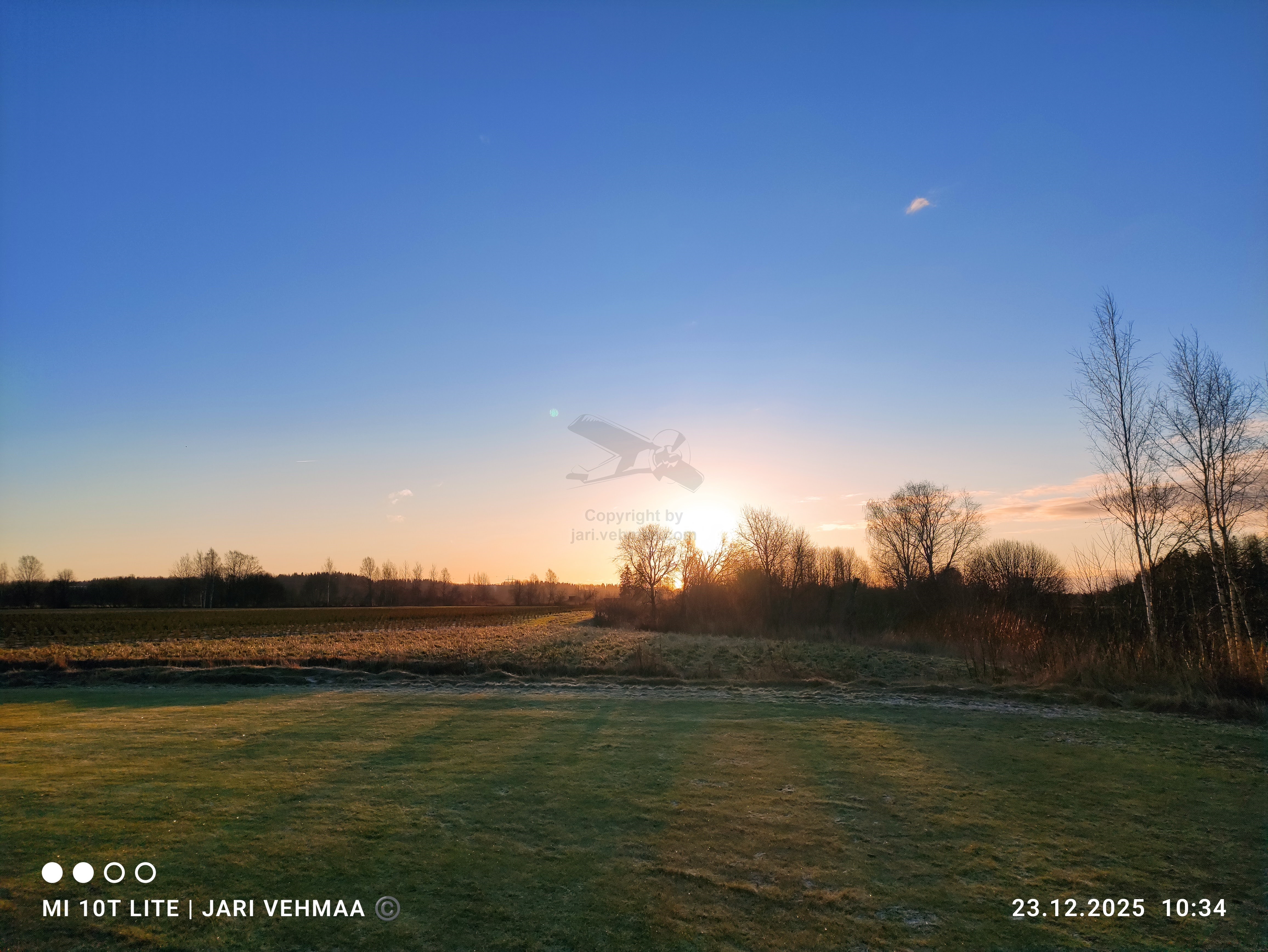 Pitkän, kostean sekä pimeän sääjakson jälkeen aina yhtä innokkaat lennokkisedät suuntasivat kohti mielenrauhan tyyssijaa. Onneksi keli oli nyt ihan ennusteiden mukainen, oli siis aivan tyyntä sekä muutama aste pakkasta. Vielä kun ei ole lunta, niin musta maa imee kaiken vähäisen valon, ennen kuin aamu aukeaa kunnolla. Olin kesäparatiisissa samaan aikaan aamun ensimmäisen auringon säteiden kanssa, jotka hädin tuskin läpäisivät harmaan pilvipeiton. Jotain aamunkajon tapaista valoa oli satunnaisesti nähtävissä pilvien lomasta.