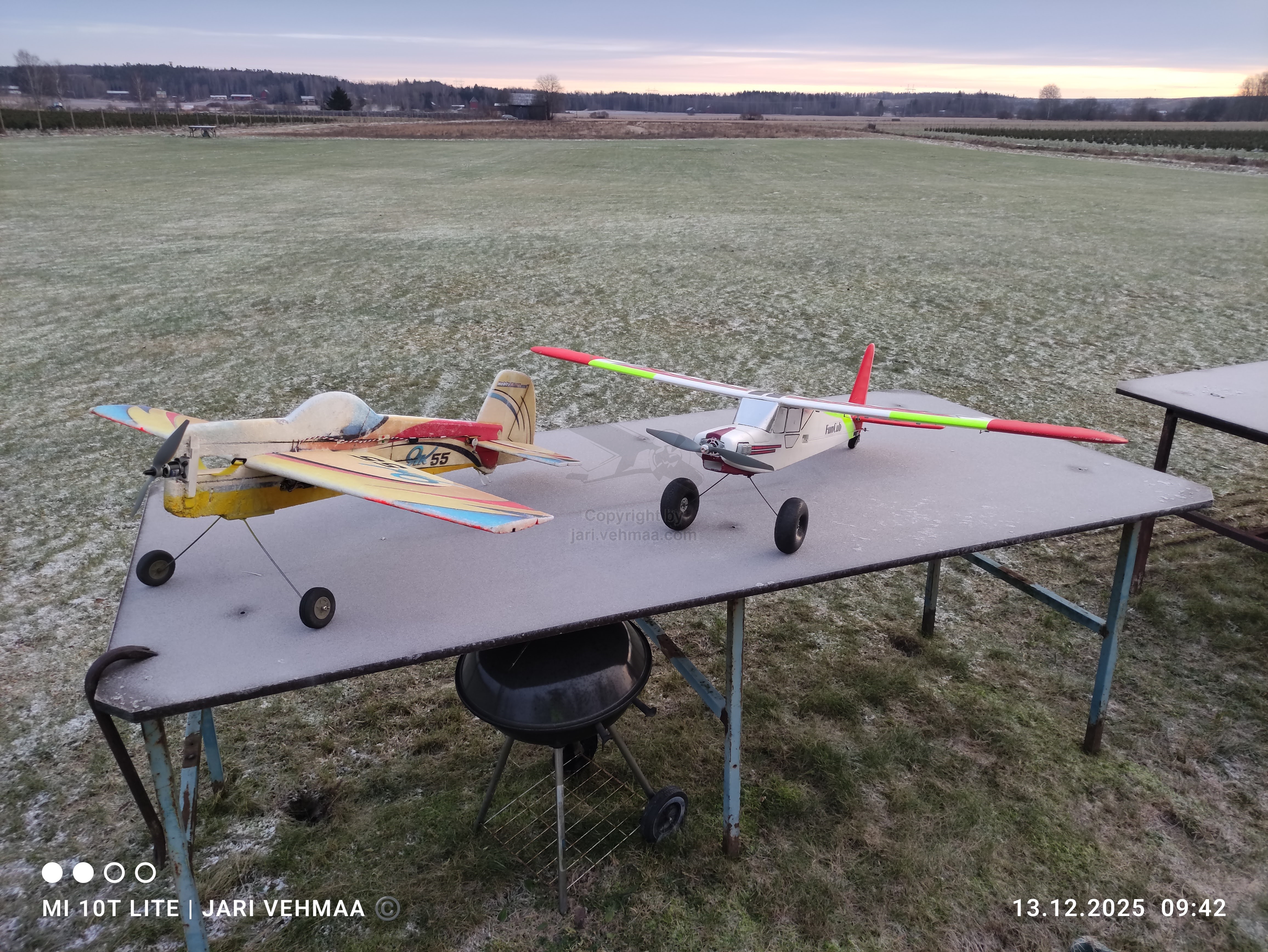 FunCup oli vielä lumien jälkeen suksivarustuksessa, mutta hyvinpä kone näytti toimivan huurteiselta/jäätyneeltä nurmikolta. Jo kahden akun jälkeen mietin vakavasti, että lähdenkö kotiin vai jatkanko. Tätä miettiessä sytytin leirivalkeat ja laitoin viralliset lennätysmakkarat elikäs Wilhelmit paistumaan grilliin. Kenttälounaan myötä tulen äärellä sain sen verran lämpö kroppaan, että lensin loput neljä akkua tyhjiksi. Kahdeksan minuutin ajastimella tiimaa kertyi minimissään 48, käytännössä hieman enemmän. Enpä ole koskaan aloittanut after work -lennätyksiä näin aikaisessa vaiheessa, mitä tänä vuonna. Vaikka nyt eletään vasta helmikuun alkupuolta, niin on se vaan hassua, että kenttä on paljon vihreämpi, mitä monena kuivana kesänä.