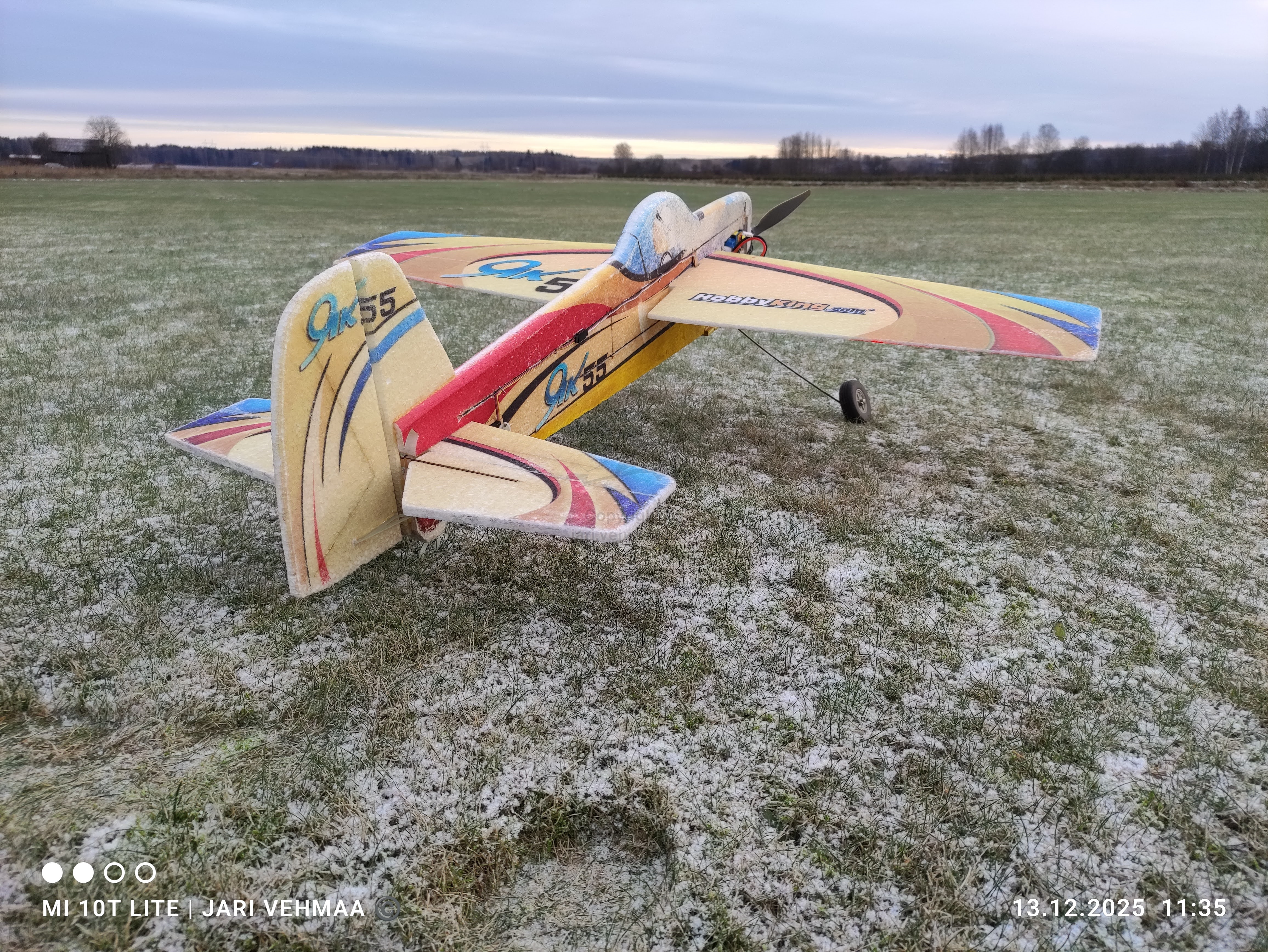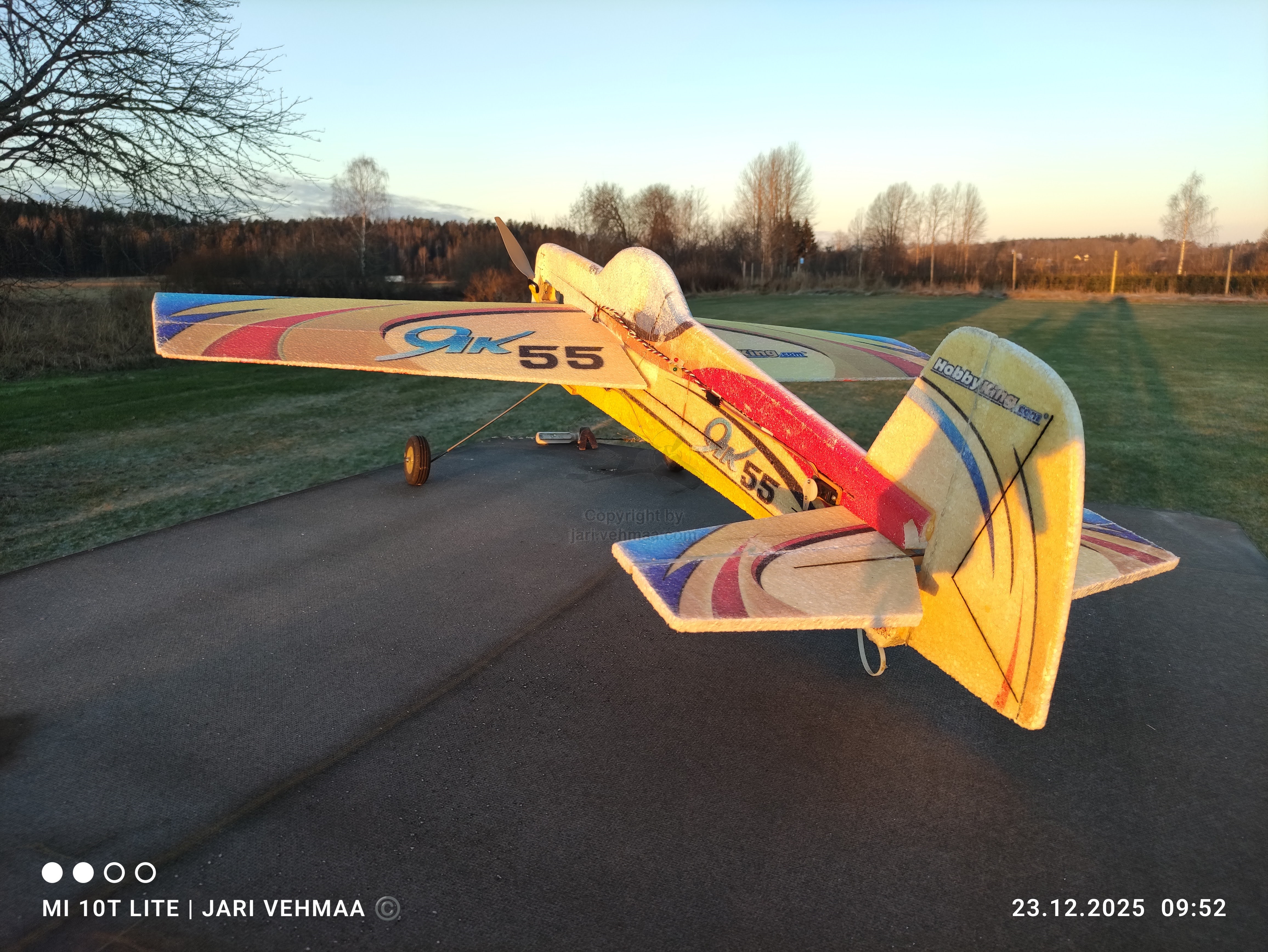 Hobby Kingin Epp Yak-55 lensi tällä kertaan Forssan pienlentokonekentällä. Maaseututukikohdassa oli aamuvarhain ollut peräti -5 C, ja vaikka lämpötilasta olikin kadonnut negatiivinen etumerkki, kentällä oli ihan hemmetin kylmää. Joo, vikaa oli myös harrastajan vaatekerrassa. Lensin viikon jäljiltä ns. vuosikerta-akut tyhjiksi, siis neljä lentoa tulin lentäneeksi tällä kertaa.
