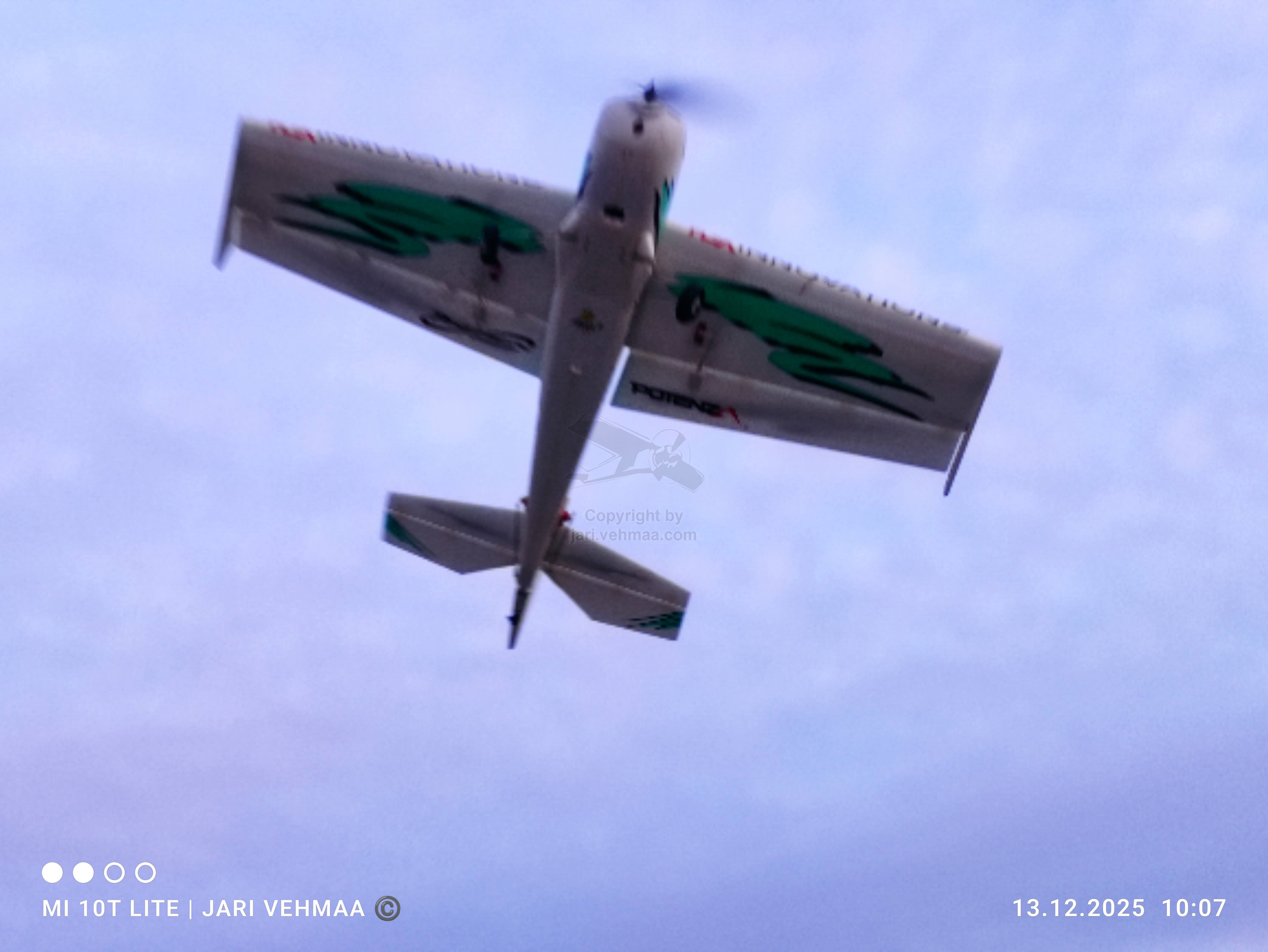 Muilla vielä täydessä iskussa olevilla akuilla lennettiin jo vakioksi muodostunut neljän minuutin 3D-kohellus. Pitää kyllä todeta, että en ole enää 3Ö-tasolla, joten vanha koirakin oppii sentään jotain uutta, kun ahkerasti tahkoaa. Olipa kaikin puolin kiva lennätysiltapäivä ja päivänvaloakin oli vielä ihan riittävästi.