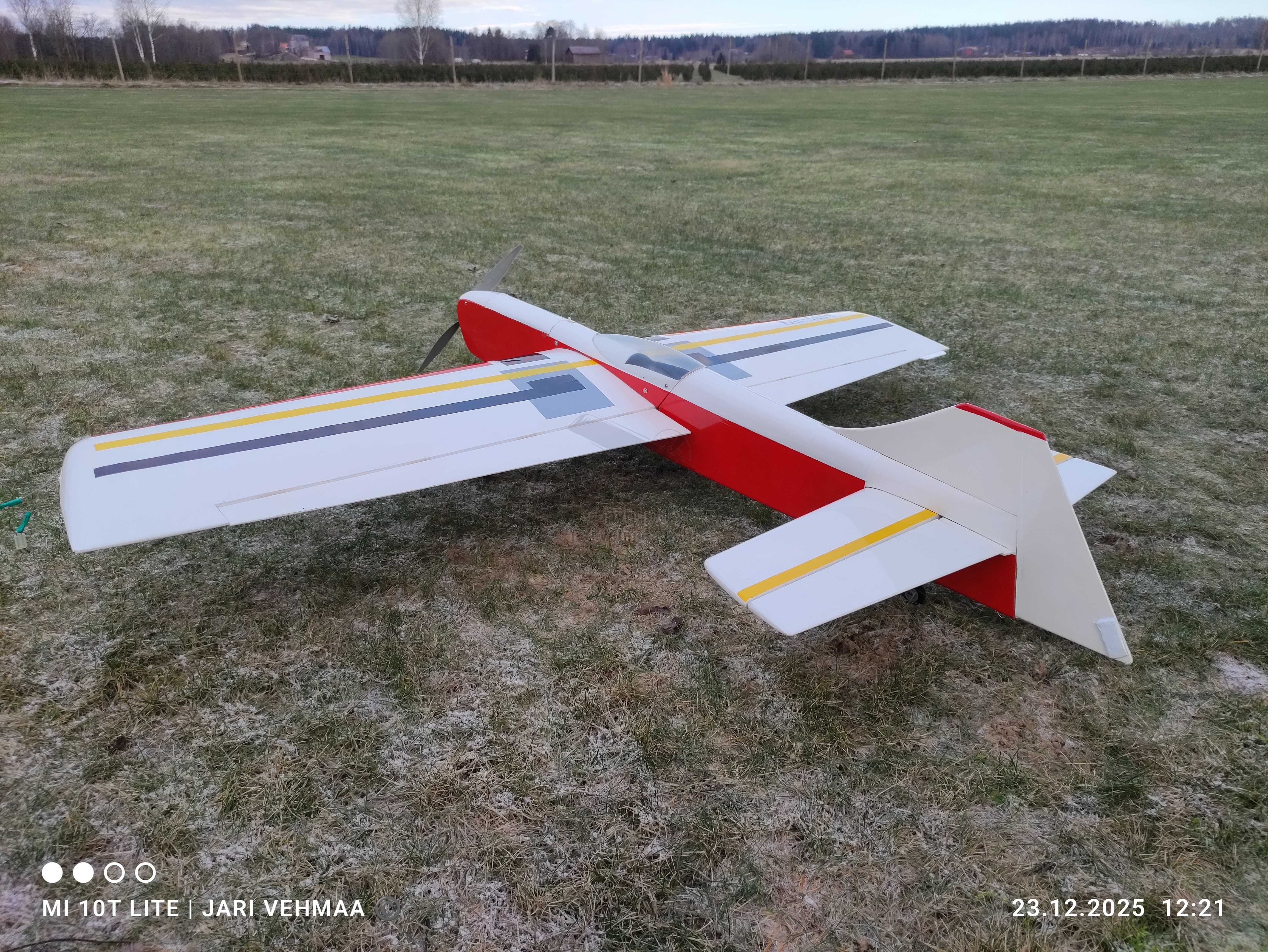 Kone oli tänään ilmassa noin 20 minuuttia neljällä eri lennolla. Aluksi korkeusvakaajan teho yllätti. Liikerata ei ollut mikään maailman suurin, mutta koneen takarunko on suhteellisen lyhyt, mikä tehosti korkeusvakaajaa. Koneessa ei ollut ihmeemmin trimmaamisen tarvetta, mitä nyt hieman työntöä piti lisätä juuri korkeusvakaajan. Yhteenvetoja voin sanoa, että käsissä on hiomaton timantti, josta saa kuiten hyvän ja soivan pelin aikaa myöten, kunhan saan kerättyä tiimaan ja säädettyä koneen mulle täydellisesti sopivaksi.