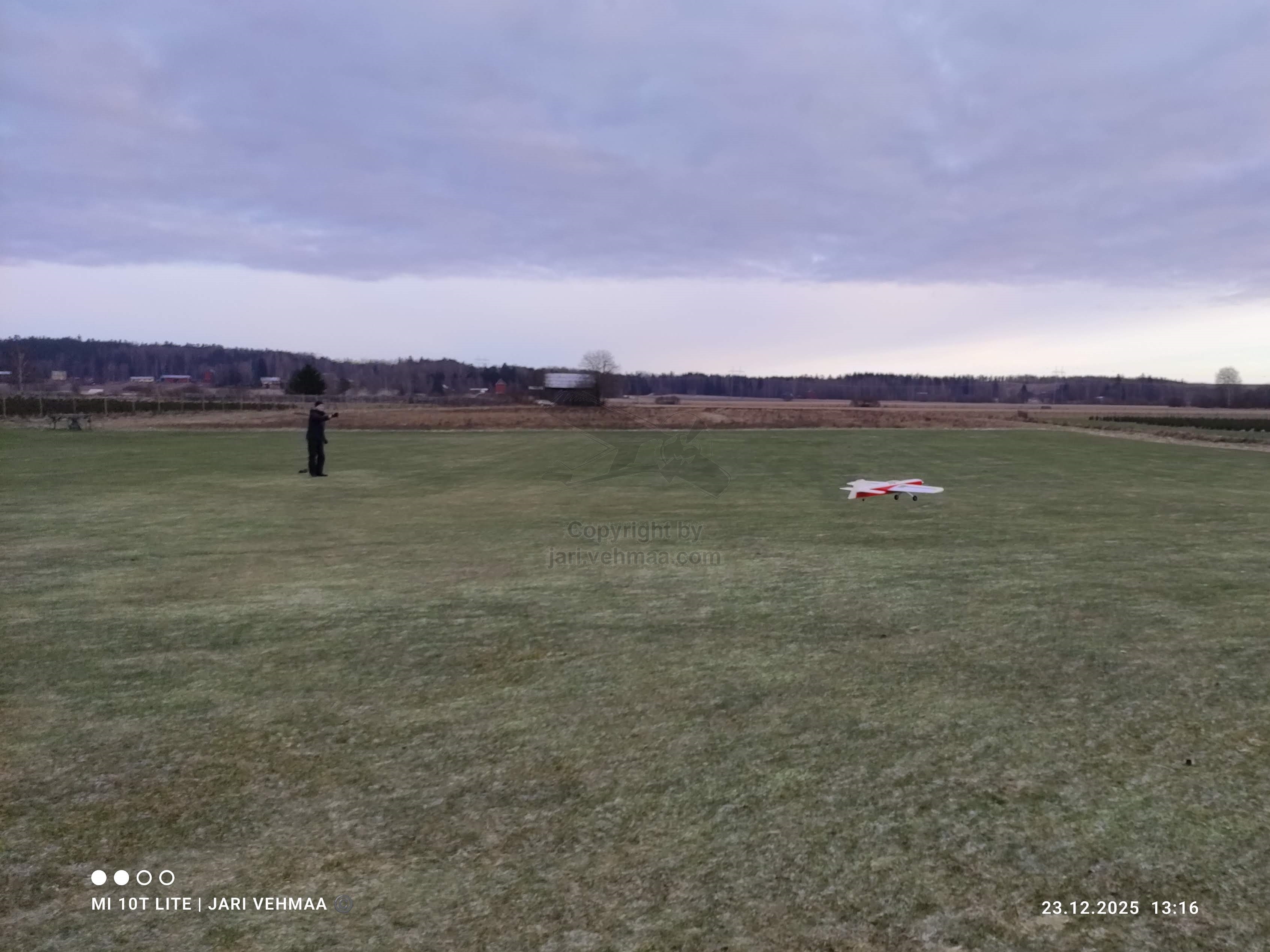 Tässä vaihessa Erkki oli tullut paikalle, kun olin jo aamulla hehkuttanut kerhon hallituksen WA-ryhmässä, miten upea keli nyt oli, kun koko joulukuu on mennyt pitkälti pimeässä ja vesisateessa. Erkillä oli mukanaan Hakcer SuperZoomin kiinalainen kopio, eli Hammer sekä Brodakin SV 11 -siimastuntti, jolla tuli kotiin SM-pronssi. Olipa kiva, kun kentällä oli joku muukin nauttimassa poikkeuksellisen upeasta lennätyskelistä.