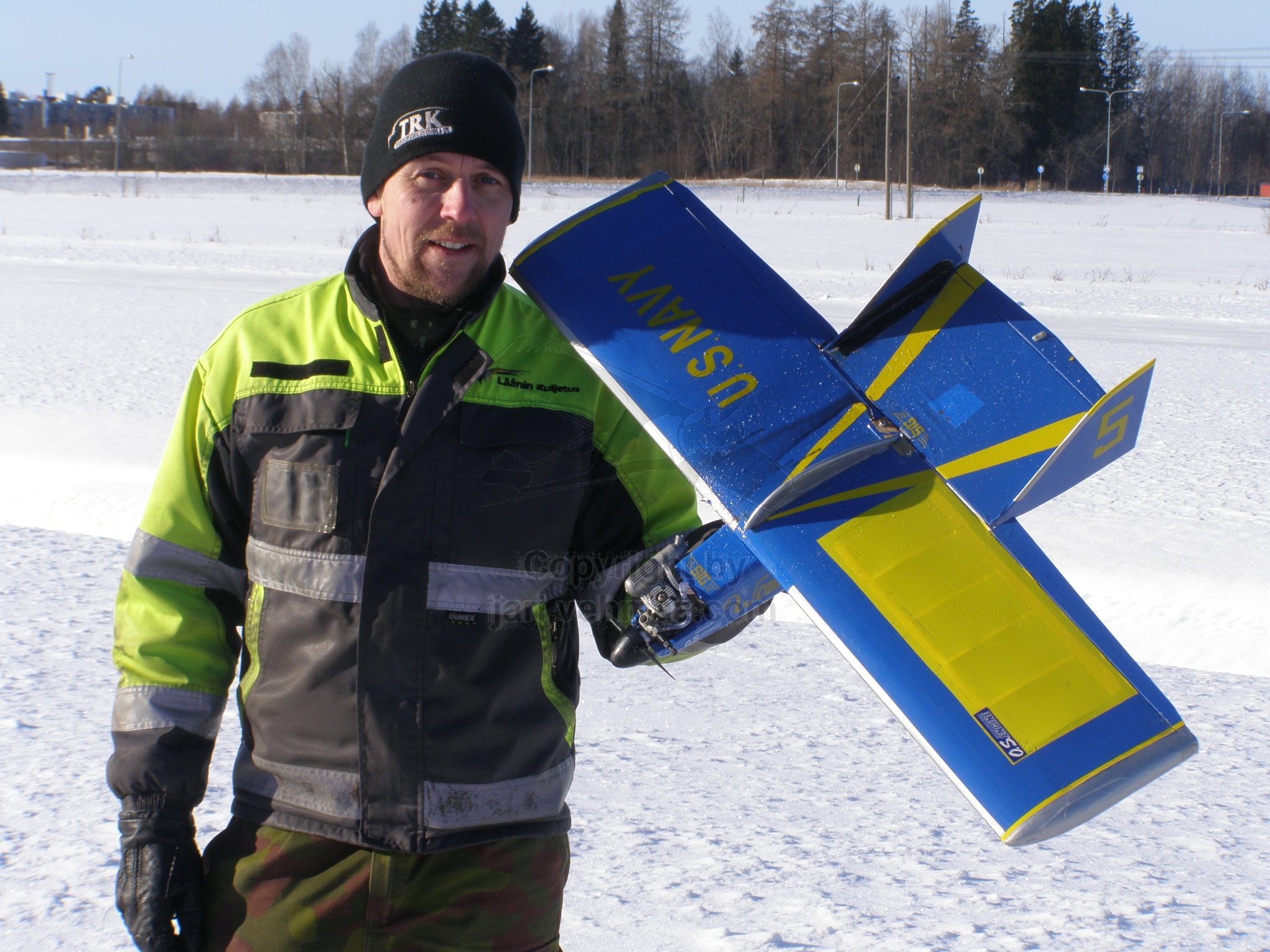 Laittelin lämpimikseni Wara-Junnun lentokuntoon, siis tankki täyteen ja siipi gummilenkeillä kiinni. Pakkanen puri näin aamusella vielä kohtuullisen kirpakasti ja nopeasti, kun aurinko vasta oli nousemassa jostain Loimalammin metsien takaa. Ryypyttelin OS 30 FS -nelitahtimoottorin 2T-bensalla, niin johan moottori pärähti puksuttelemaan totutun tuttuun tapaansa. Neula oli auki jotain 1 ½ kierrosta. Nostin koneen siivenkiinnityskumilenkeistä baanalla ja sitten hanaa. Näin tyynessä kelissä oli ihan sama, mihin suuntaa koneen otti ilmaan. Ilmassa moottori käynnistä ei pystynyt päättelemään oliko ilman lämpötila -15°C vaiko +30°C, millä skaalalla Ossia on tähän mennessä ajettu. Tyhjäkäynti oli yhtä kaunista ja tasaista, mitä se on aina ollut.