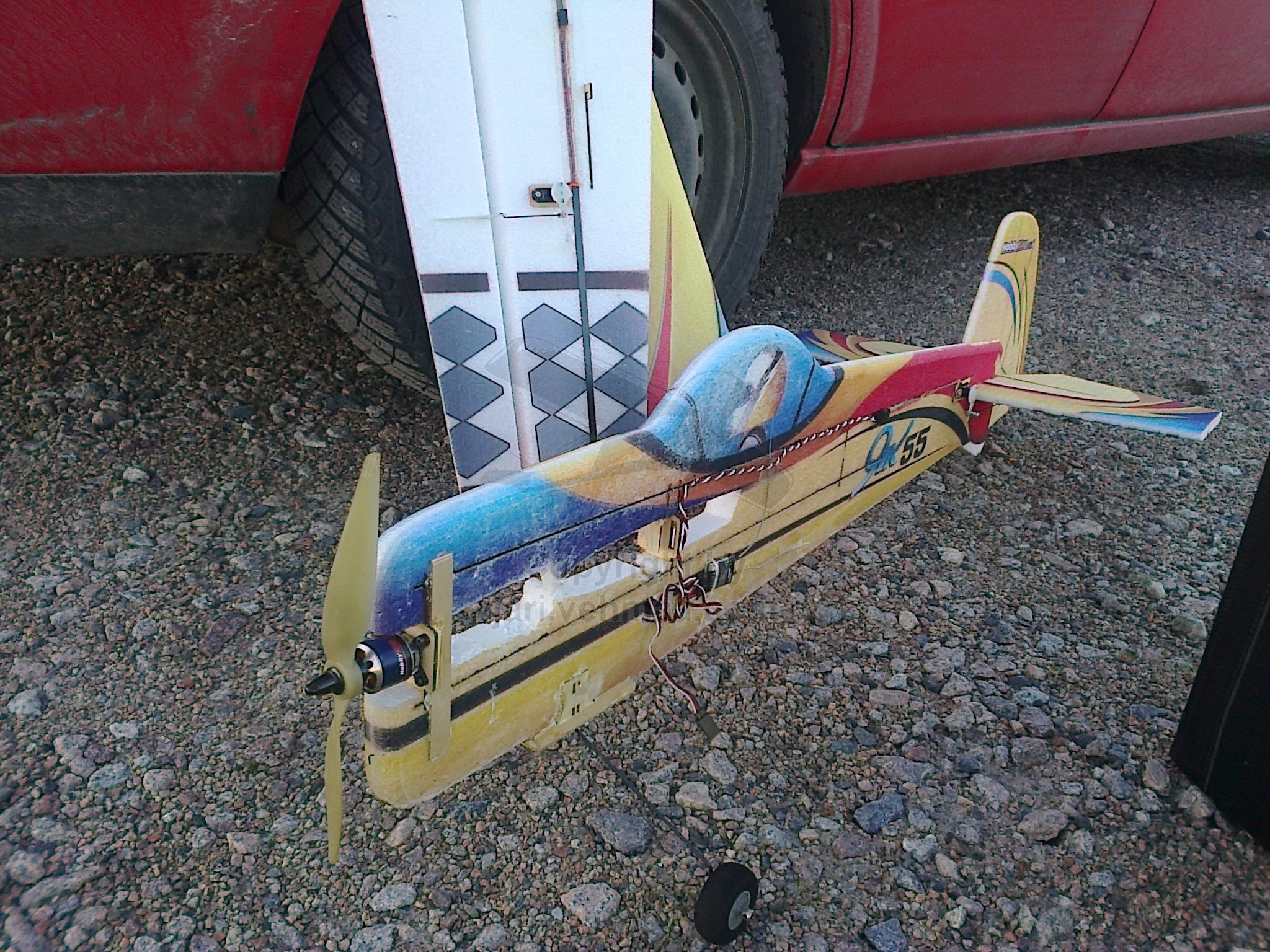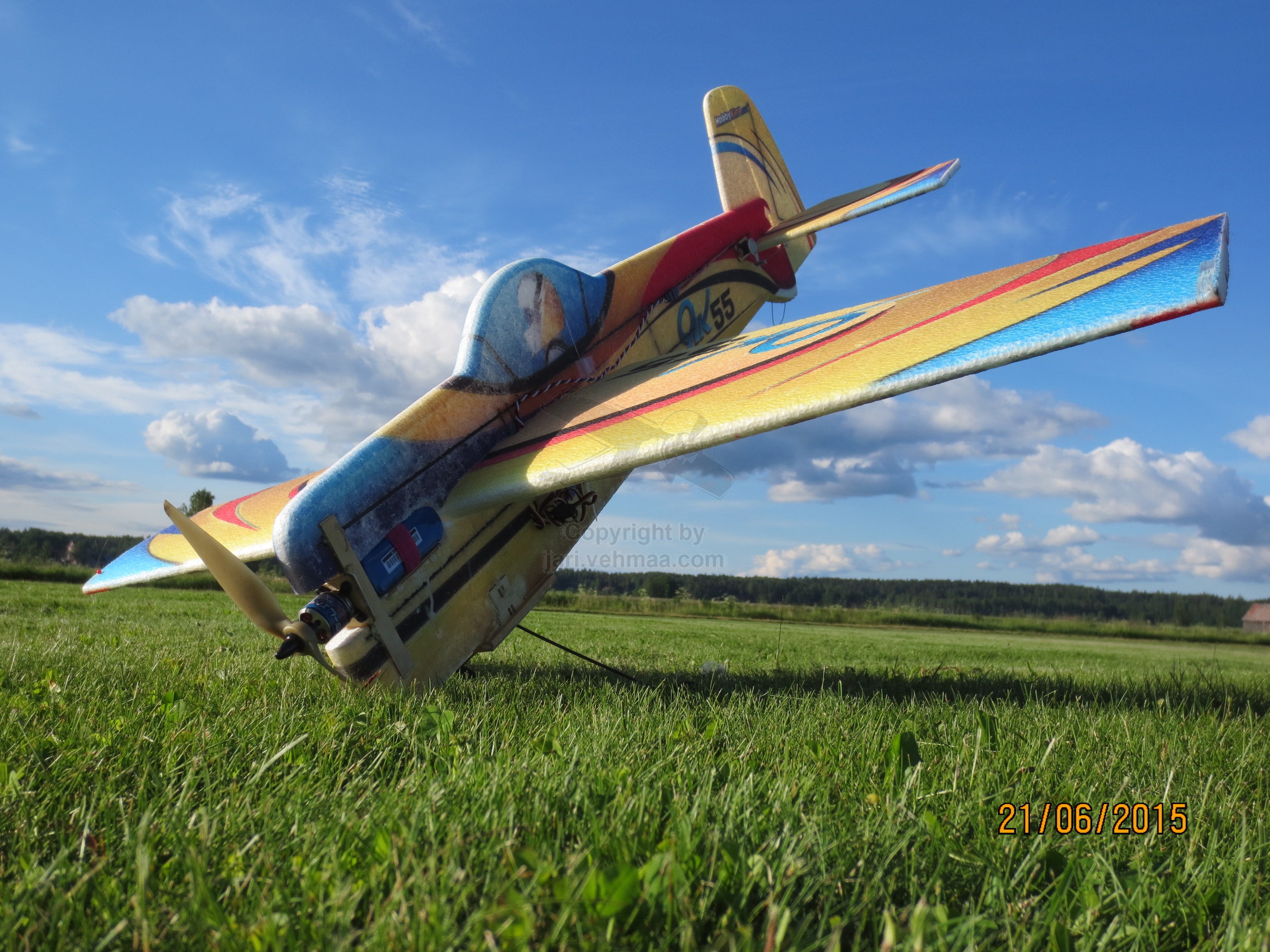 Päivän päätteeksi kaahasin EPP-Yak 55:lla koko akkusetin tyhjiksi, mistä kertyi tiimaa reilut puoli tuntia. Koneella on takan päin ihan kunnioitettavat 180 lentoa. Välillä säädin ei käynnistänyt moottoria, vaan jäi jurnuttamaan kummasti. Pari kertaa ilmassa säädin teki omiaan, ihan kuin olisi lennossa heittänyt reverssit päälle. Ensimmäisellä kerralla luulinkin, että potkuri irtosi. Plakkarissa on kyllä varamoottori, katsotaan ensin, miten se toimii samalla säätimellä.