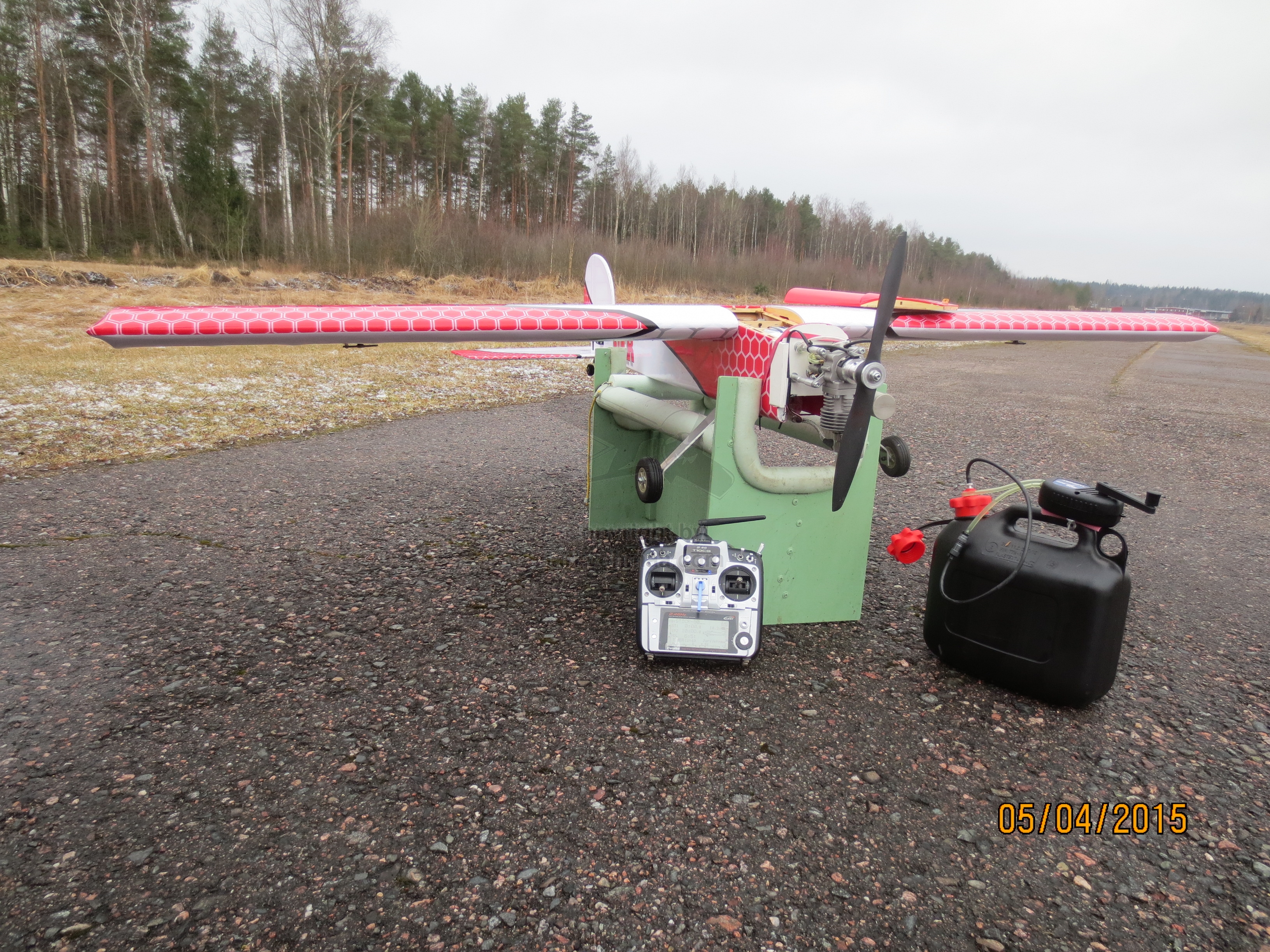 Olin säätänyt lähettimen ajastimen huomattavan lyhyeksi eli vain viiteen minuuttiin. Ennen laskua olin ottanut pari koeluontoista lähestymistä. Tietty uudella koneella laskuun tuleminen ja tällä kertaa vieläpä hallitusti kaasun käytöllä edellytti asiaan kuuluvaan kunnioitusta. Laskussa jouduin hieman pumppaamaan kaasua, kun tosiaankin olen vasta ottamassa tuntumaa koneeseen. Lähestymisen päätteeksi kone istahti varsin pienellä nopeudella asfaltille. Sammutin moottorin ja kävin hakemassa koneen starttipaikalle. Ensimmäinen hallittu ja onnistunut koelento kesti 4'54". Varikolla kurkkasin luukun alle ja bensaa oli mennyt vajaan sentin verran 400 ml tankista.