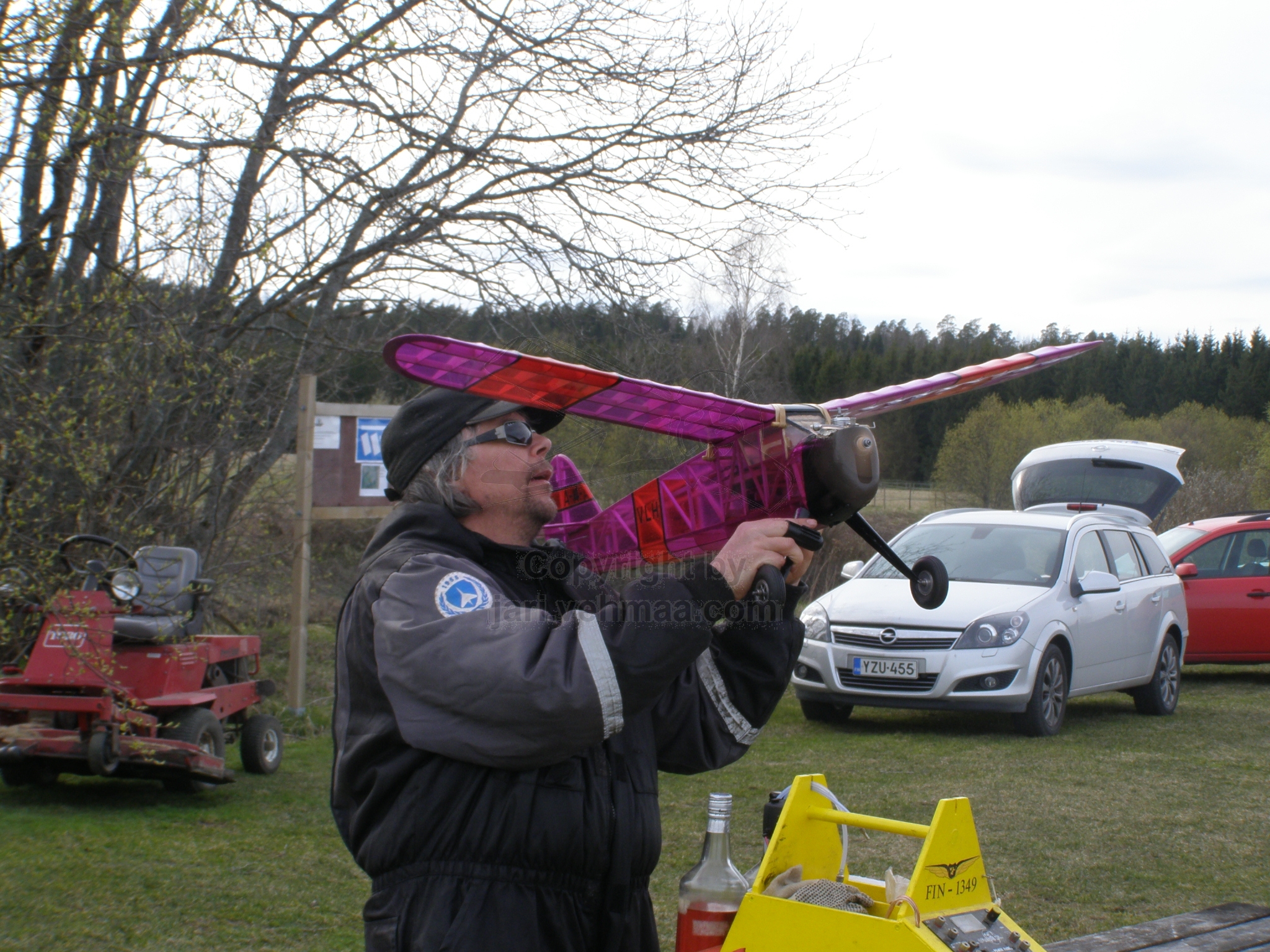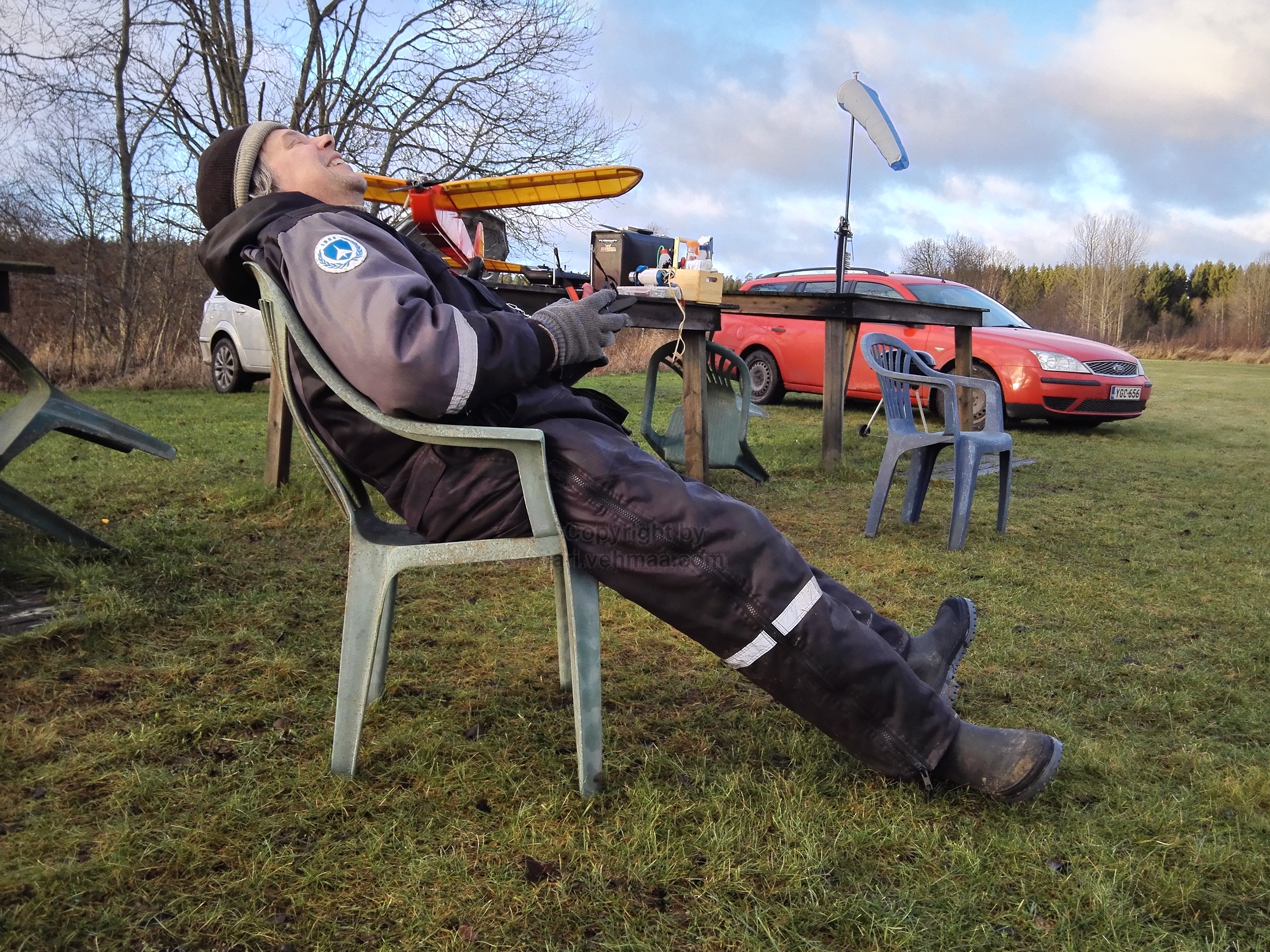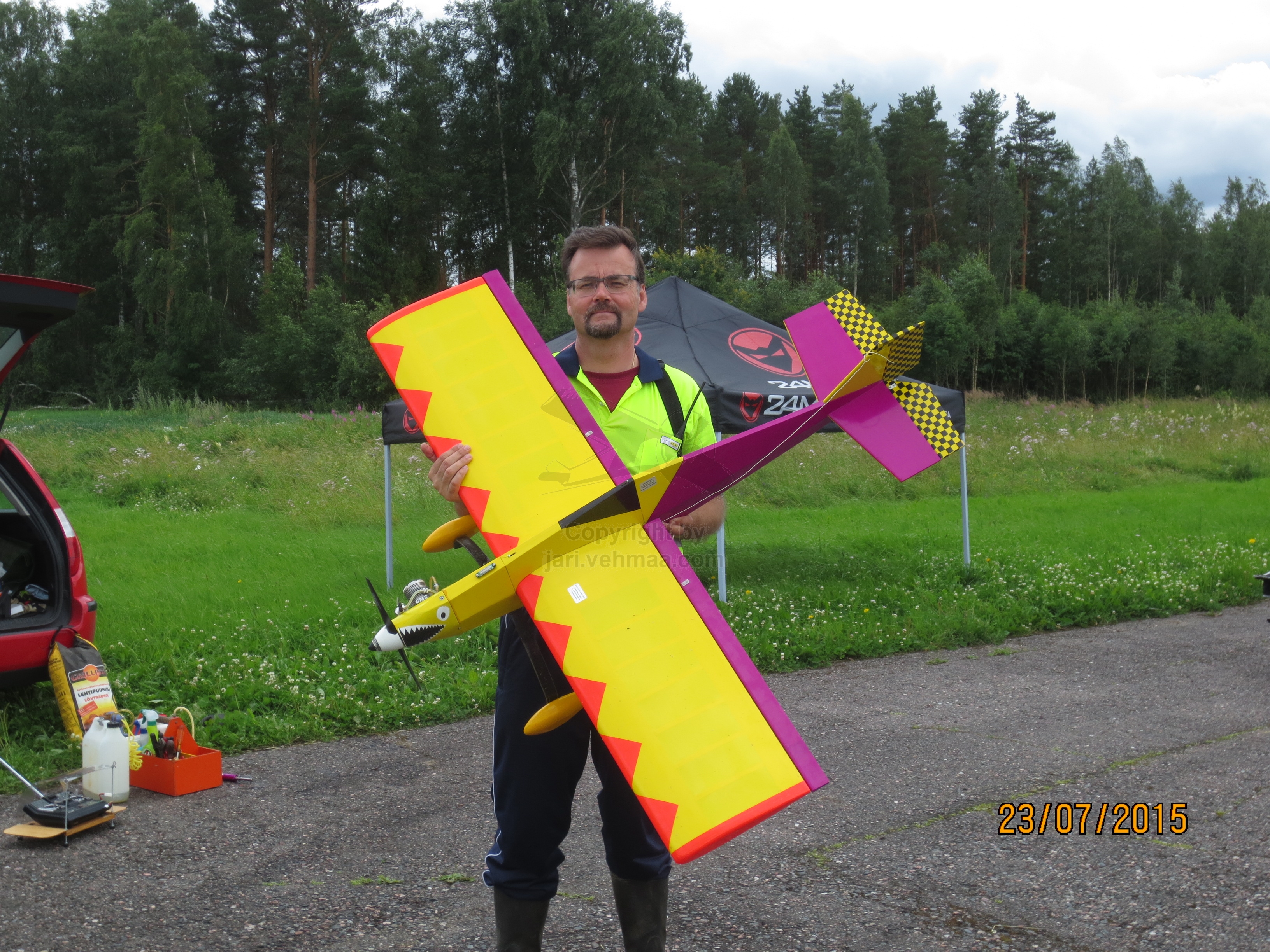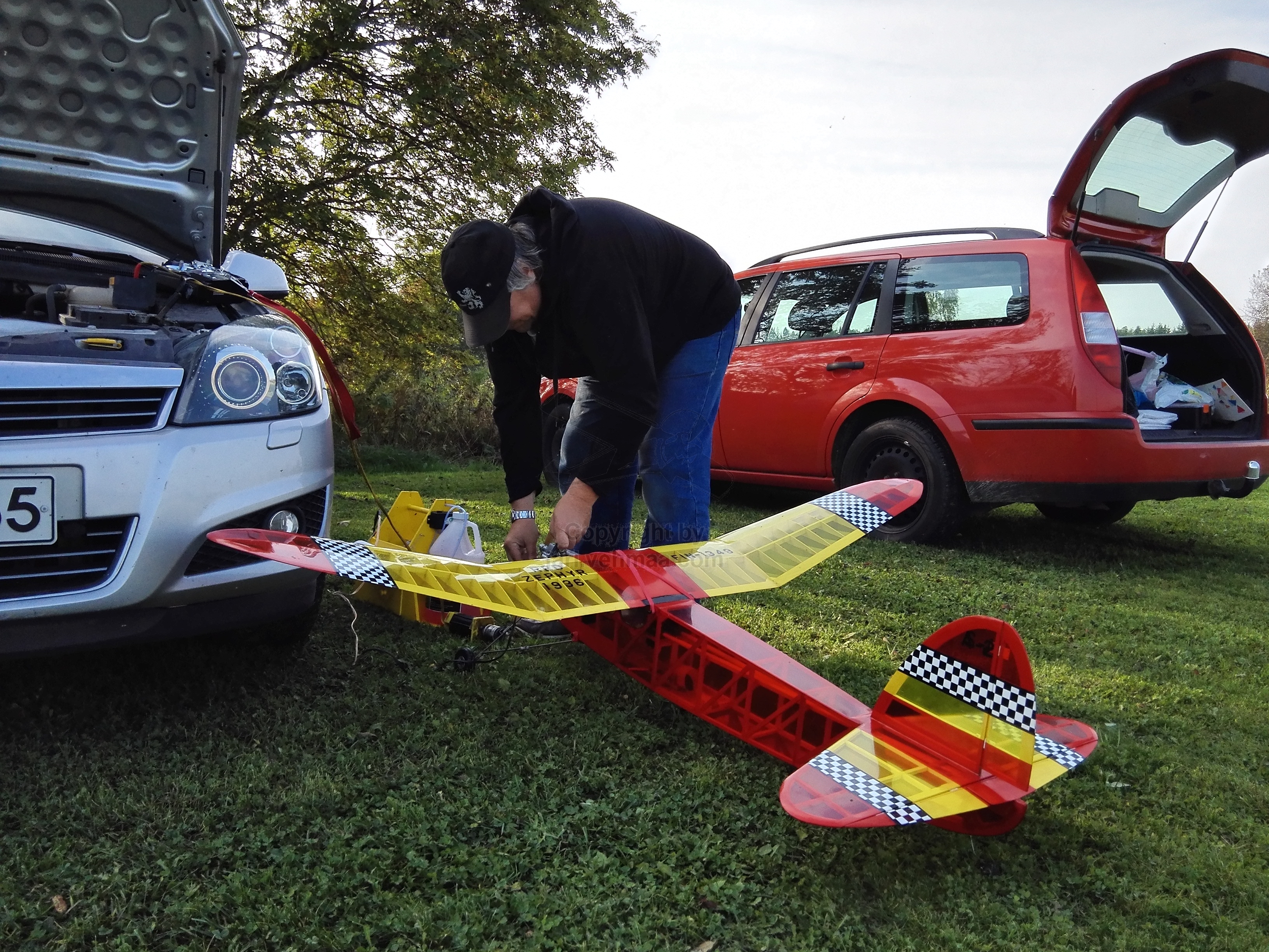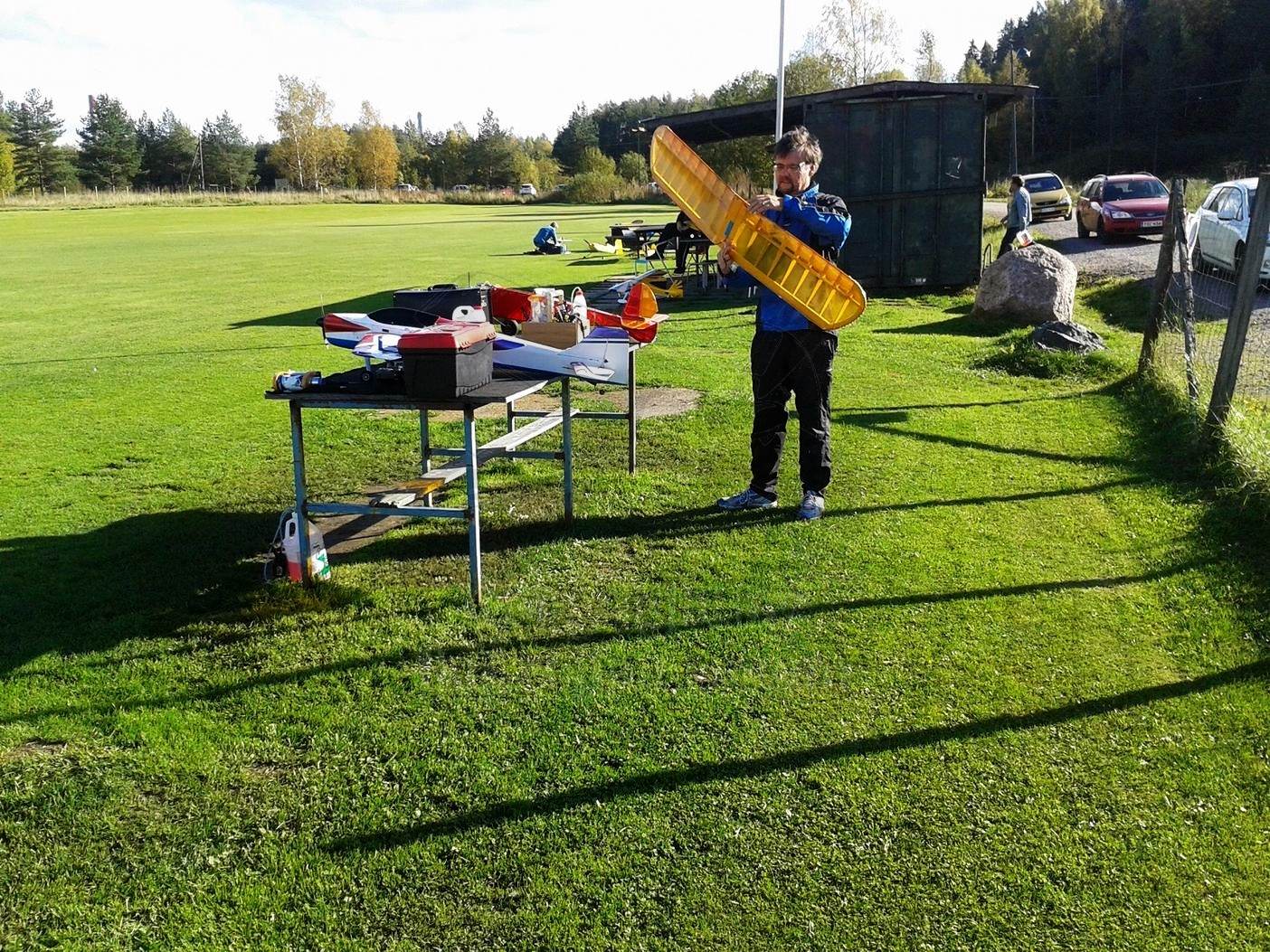 Ford Mondeo oli taas piri pintaan lastattu harrastemateriaalilla. Jo vakiintuneen varikkoteltan viedessä leijonan osana tilasta, mukaan sullottiin vielä varsinainen lentokalusto; uusi Junior 60" -old timer, Phoenix 1 -klassikkostuntti, Pekalle trokattu Balck Magic -old timer ja Electric Blue Phoenix -sähköliidokki. Tähän sitten vielä hiilisäkki, kenttäpakki ja -tuoli, muutamat salkut ja polttoainepänikät, niin eipä tilaa ollut enää muulle kuin kuskille - ja makkaroille.