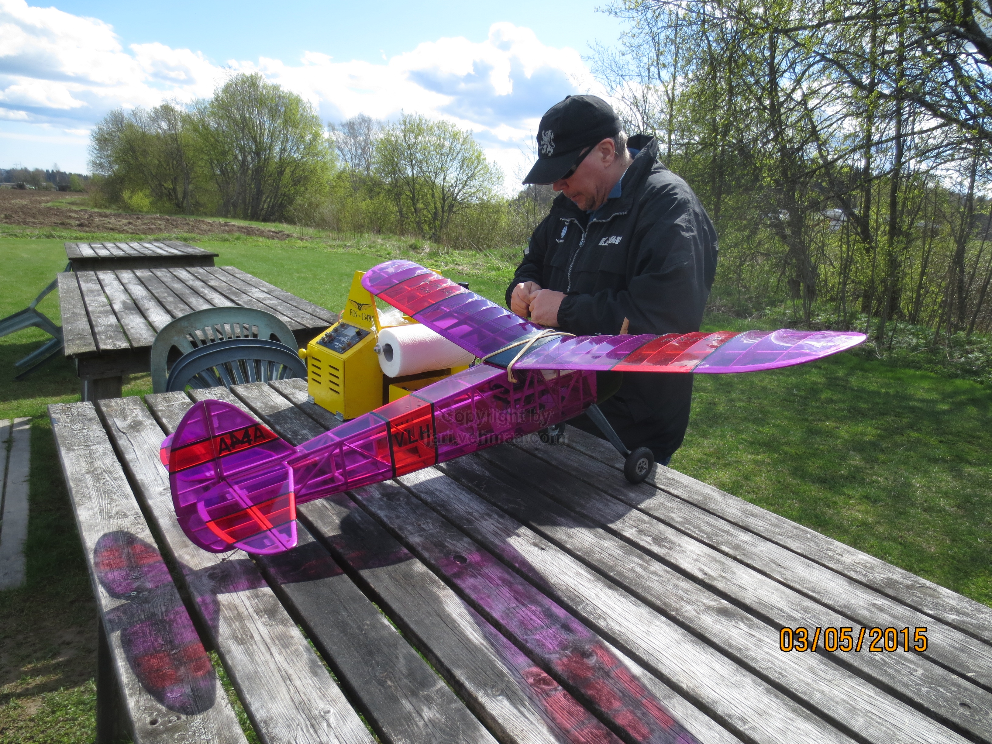 Aamu aukeni varsin aurinkoisena lupaillen hienoa lennätyspäivää. Olinkin kevätparatiisissa jo vähän yli yksitoista. Calmato oli äkkiä ruuvattu kasaan. Uusi kellertävätsä vaahtolevystä tehty kuljetus- ja kasausständi näytti toimivan erinomaisesti edeltäjäänsä verrattuna. Se pysyy tiukasti koneen rungossa, eikä muljahda alta pois, vaikka ajettaisiinkin töyssyistä tietä. Kentän nurmikko oli jo reilusti vihreämpää, mitä viikko sitten. Peltoaukealla tuuli tuntui aika kovalta, mutta näillä bofori-lukemilla mennään, kun tänne asti ollaan tultu. Tuulimittarin patteri oli näköjään loppu, eikä tarkkoja lukemia saatu dokumentoitua.