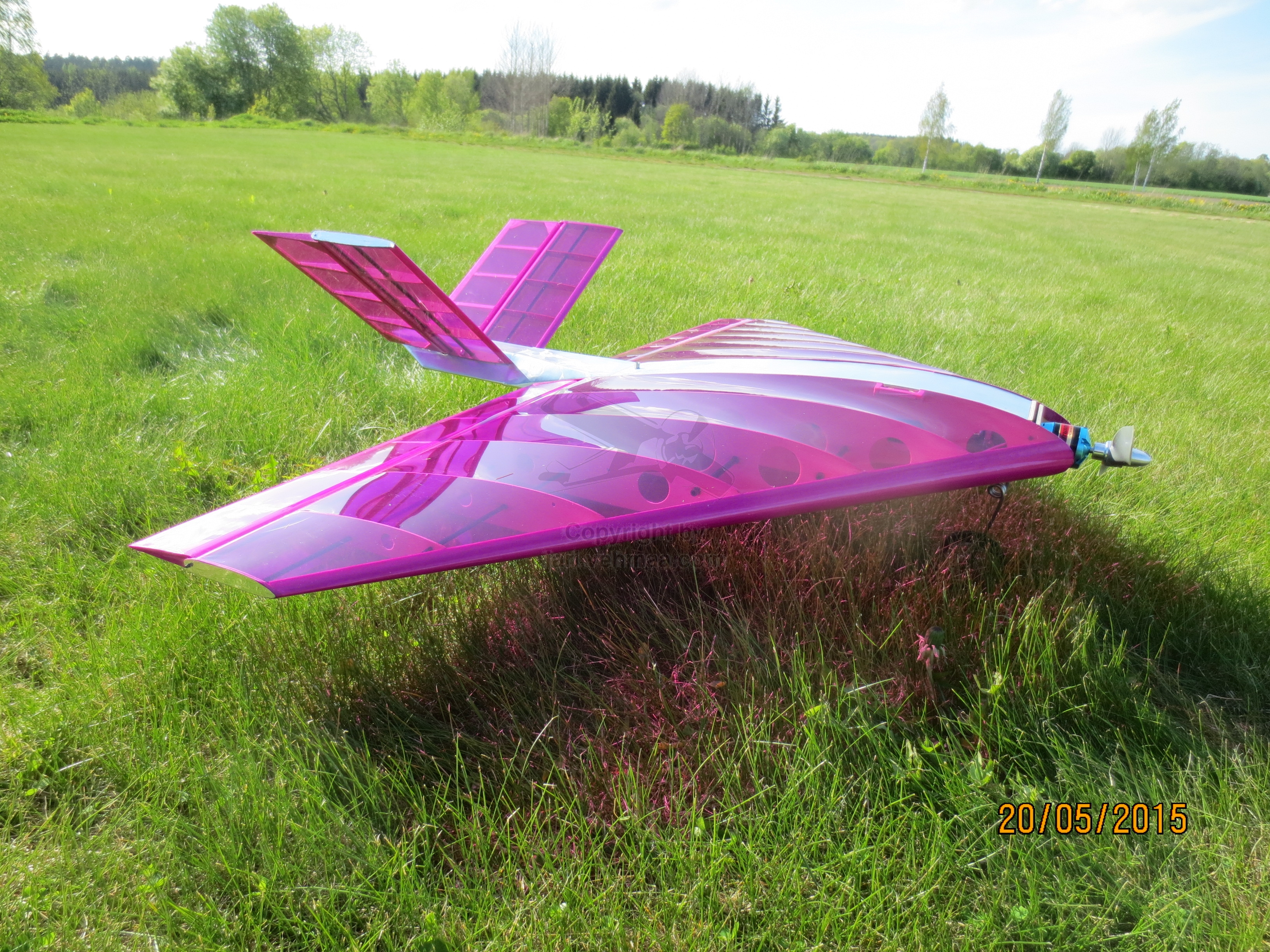 Wara-Junnun jouduttua joksikin aikaa vaihtopenkille, jäin kaipaamaan nelitahtimoottorin papatusta. Pitkin kevättä olikin ollut mielessä, että lähestulkoon koko 2000-luvun seinäruusuna olleen NotForSalen olisi jo korkein aika kohota siivilleen. Olin pari päivää aikaisemmin kaivanut koneen naftaliinista ja käynyt sen päällisin puolin läpi. Lähettimen setup oli tallessa jollakin arkisto-CAMPackilla. Liikeratoja suurentelin, kun ne jo pöytätestissä tuntuivat sangen vaatimattomilta. Vastaanotin ja akku koneeseen, niin kaikki olisi kunnossa.