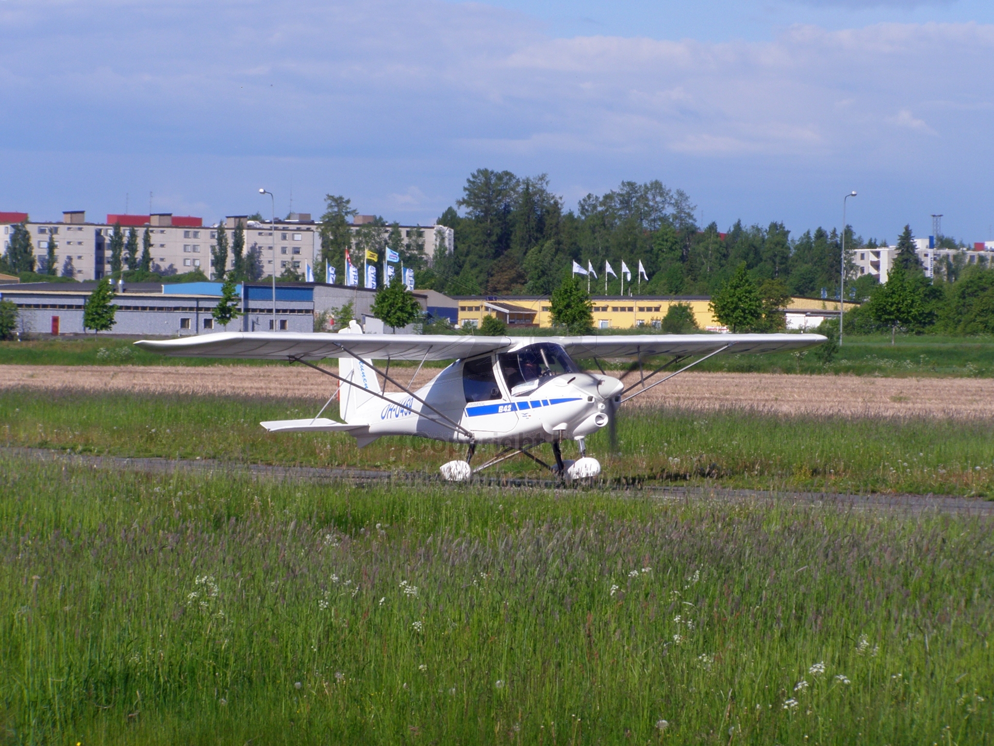 Tämän jälkeen ei auttanut muu kuin käynnistää moottori ja valmistautua lennolle. Moottori kävi hyvin, tosin tyhjäkäynnin kierrokset olivat aavistuksen turhan korkeat ja niinpä rullaus olikin turhan vauhdikasta. Annoin koneen asettua keula 04-suuntaan baanalla ja sitten avasin kaasun ja lähdin nousukiitoon. Kannuskone irtosi nätisti asfaltilta. Myönnetään, että lento vähän jänskätti, aina pitää olla nöyrä kun ollaan koelennolla, vaikka takana onkin vuosikymmenten ja kymmenien koneiden kokemus. Tyydyin kaartelemaan koneella aika rauhallisesti kentän tuntumassa, yrittämättä vääntää mitään sen kummempaa liikettä. Otin koneen laskuun varmaan reilun viiden minuutin lennon jälkeen moottorin käydessä.