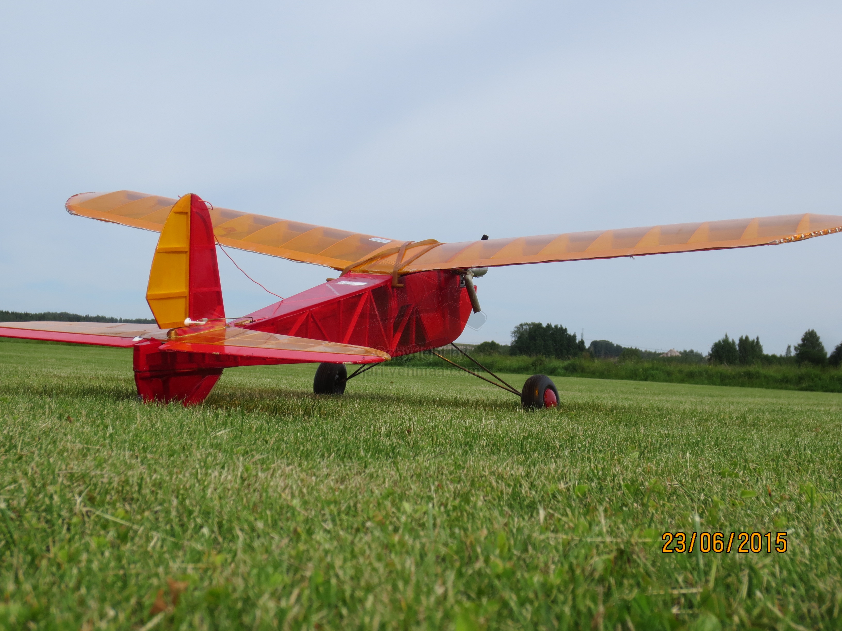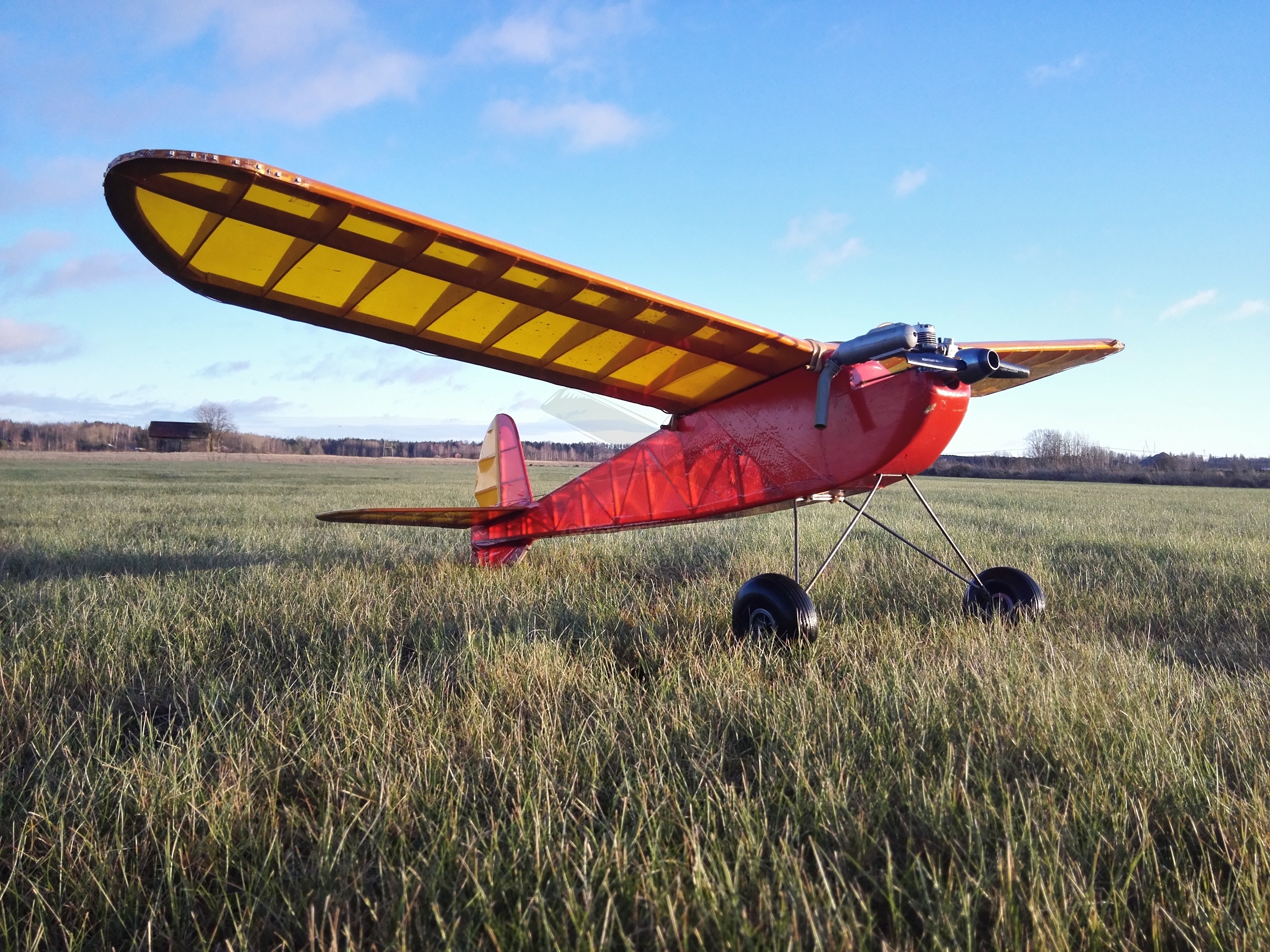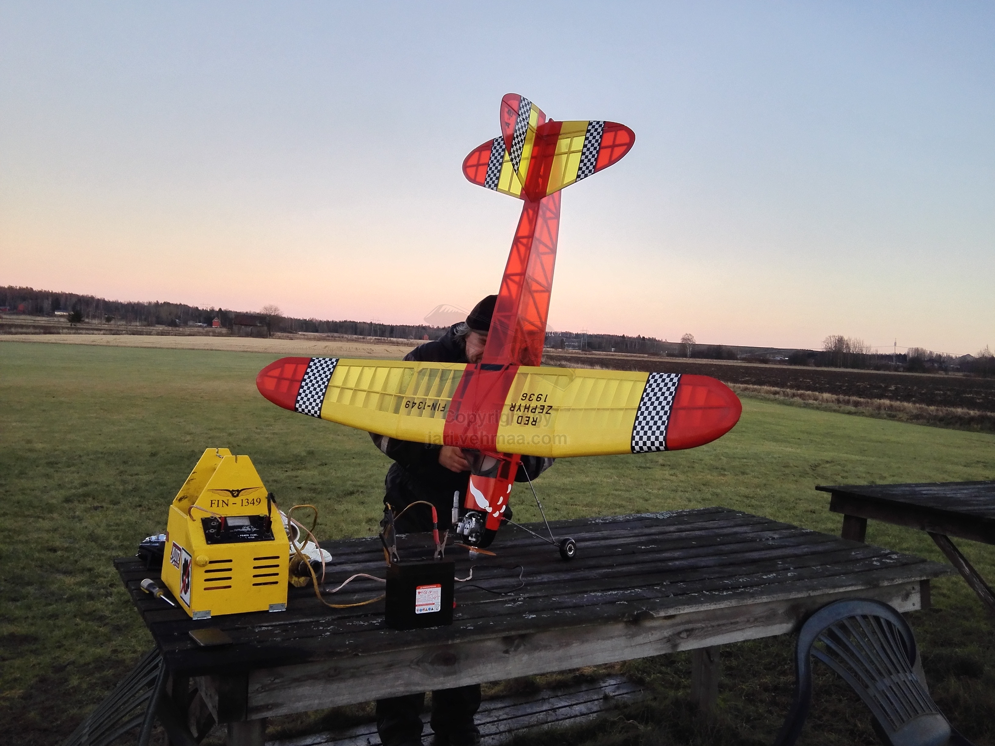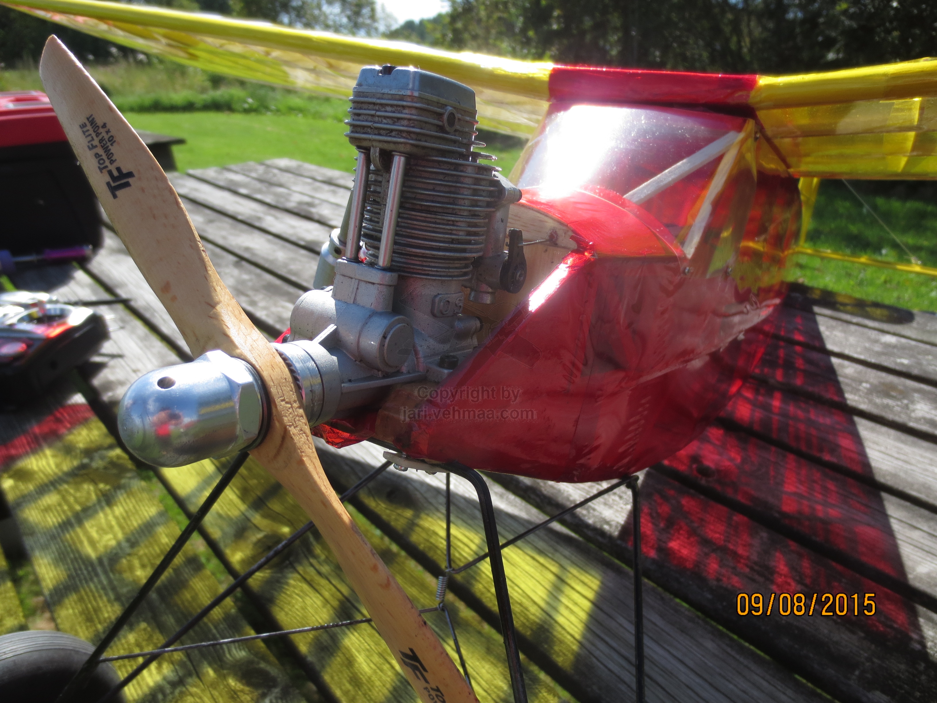 Olin aivan ihmeen kaupalla saanut haalittua lennokit.net:stä parit old timer-helmet; Junior 60" ja Black Magic, josta jälkimmäisen lupauduin myymään Pekalle. Junnun värisävyt olivat suoraan sanottuna peffasta, mutta eipä tuon hintaluokan koneesta sovi valittaa ja mikä tärkeintä, kone oli täysin ehjä. Erityisesti minua ilahdutti se, että OS 30 FS -nelari meni ihan heittämällä moottorin kiinnitysreikiin. Muutin ainoastaan tankin paikan, minkä vuoksi jouduin poraamaan uuden reijän letkuille. Mukana tulleet servot saivat jäädä vanhoille paikoilleen. Moottoria päristelin jo edellisenä iltana, joten kaikki oli taas mallillaan mun kolmannen Junnun koelentoa varten.