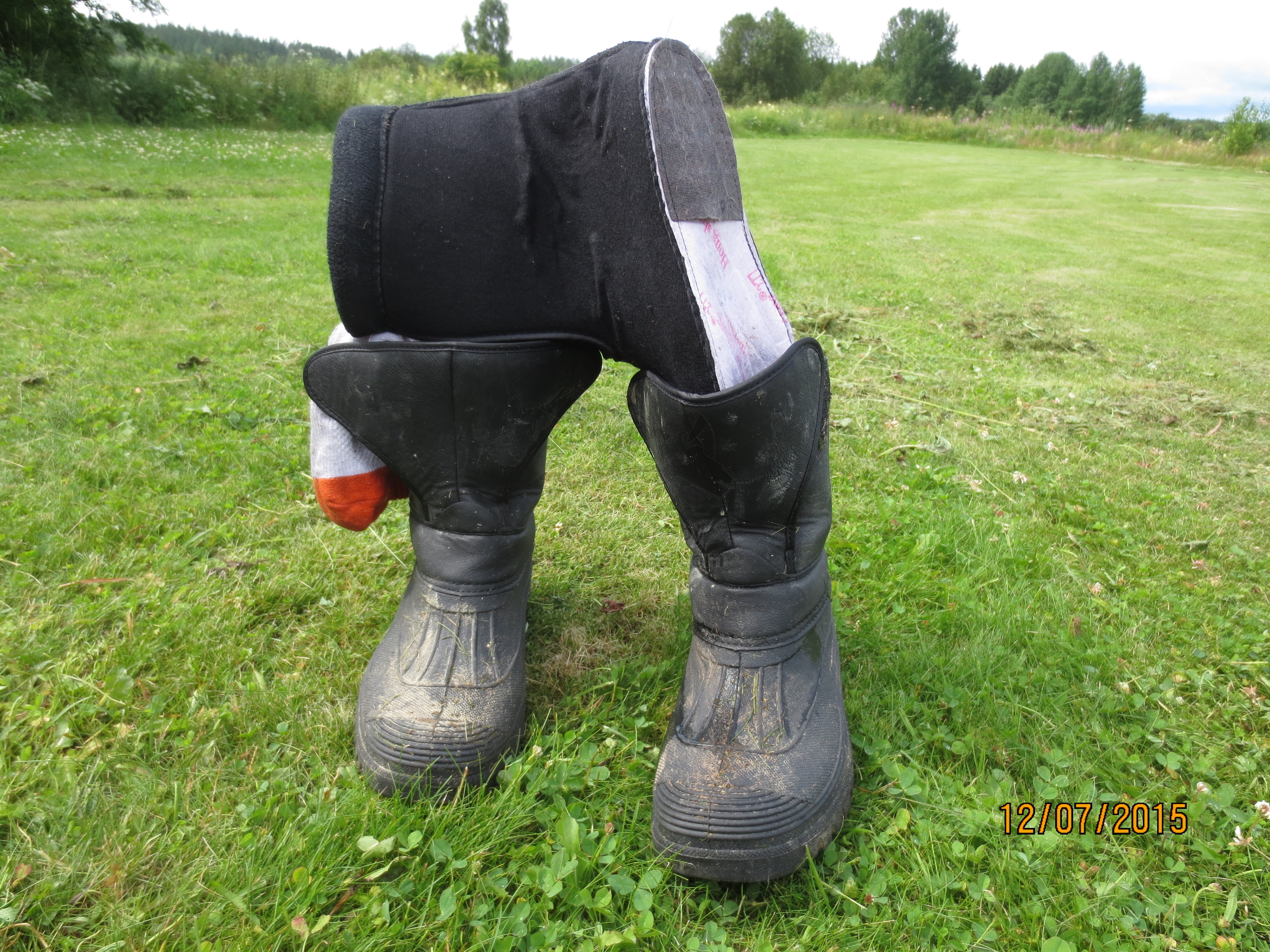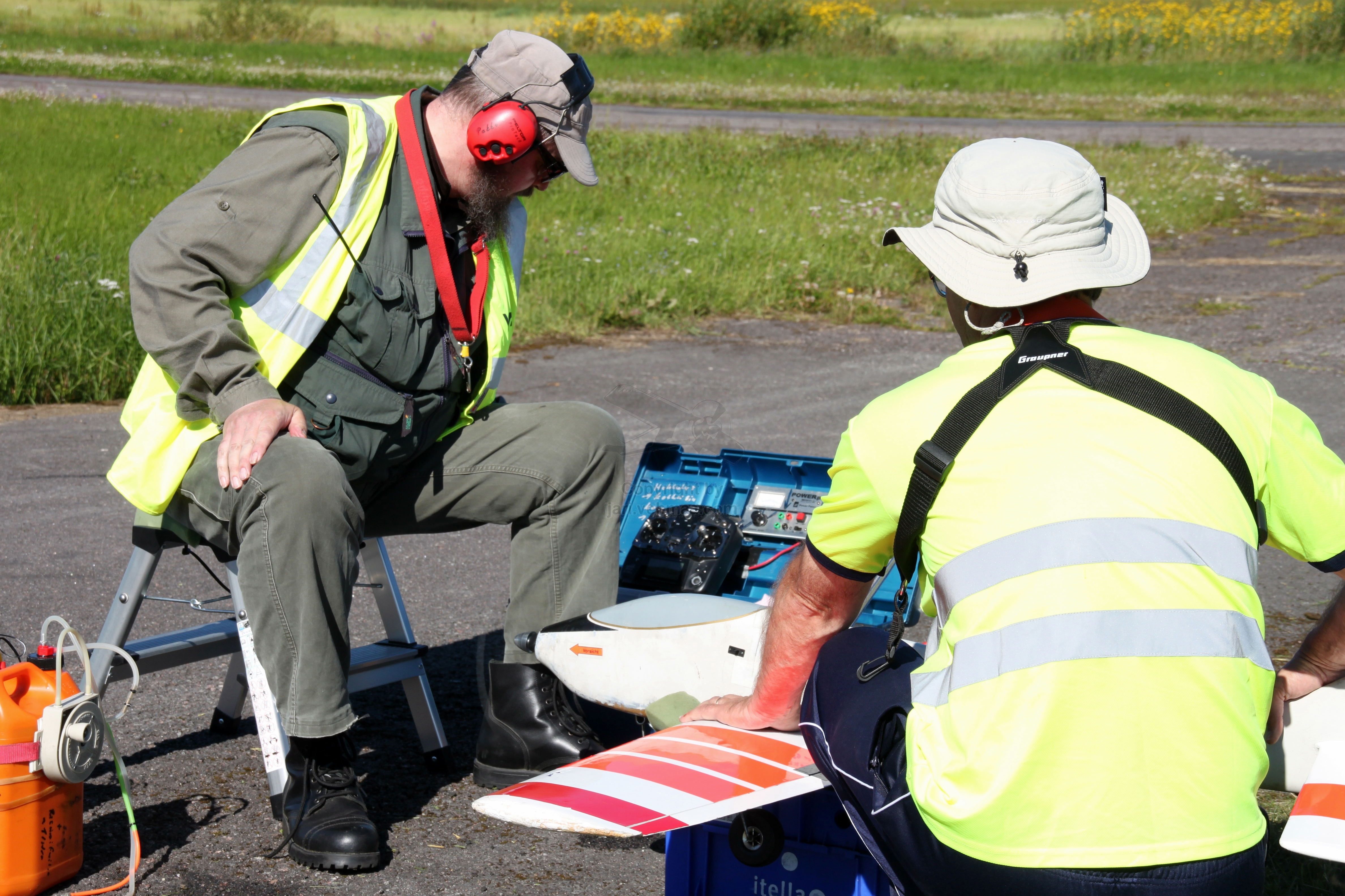 Seuraava nousuyritys jäi sitten yritykseksi koneen päätyessä vauhdilla käärmeilyn jälkeen nurmikolle. Tulppa taisi kastua, kun konetta sai mätkiä ihan olan takaa, että se olisi käynnistynyt. Tässä välissä pidettiin sitten pieni luova tauko ja jutusteltiin Riston Ja Robinin kanssa.