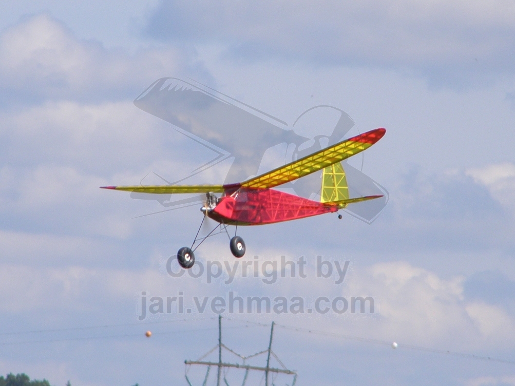 Ossi lähti iloisesti papattamaan ja pienen koekäytön jälkeen kone viskattiin ilmaan. Ilma menetteli lennätykseen, mutta mitään paras mahdollinen se ei ollut, Junnu keikkui ja kiikkui aika kovasti levottoman tuulen riepotellessa ilmojen sanasaattajaa. Moottori sammahti noin kymmenen minuutin (10'03") pöristelyn jälkeen polttoaineen loppumiseen.