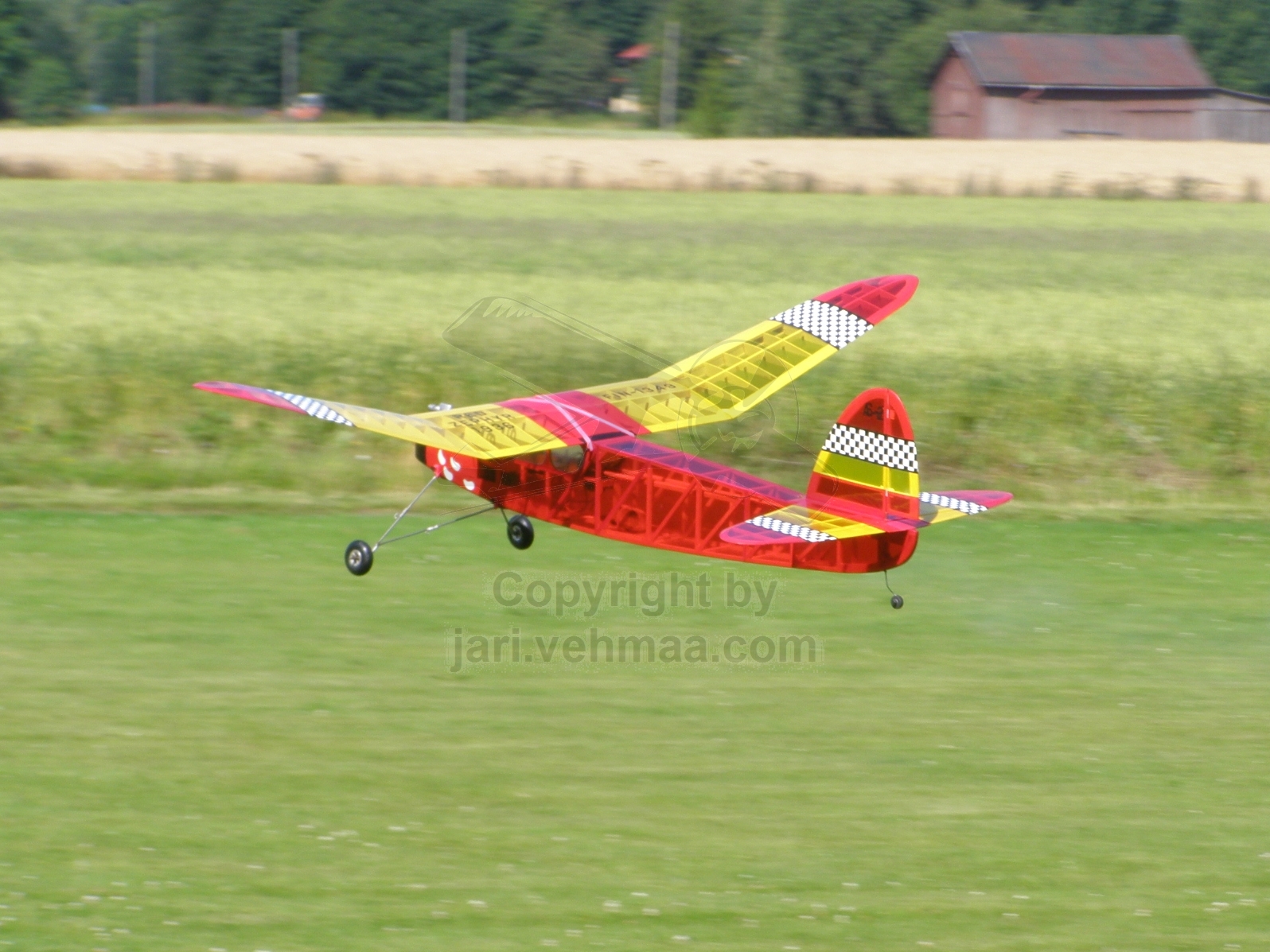 Ensimmäisen nousun keskeytin, kun lähdin nousukiitoon kone vapaa ja siitä kaasua lisäten. Uusi yritys tehtiin jarrulähdöllä ja täydellä kaasulla. Nyt saatiin heti alusta alkaen täysvauhti päällä. Annoin koneen kerätä nopeutta nurmikolla pomppien ja reilun kiidon jälkeen Calmato nousi varsin vakaasti siivilleen. Lennossa sitten olikin jo ihan sama oliko tuulta vai ei. Aika lyhyen (3'30") lennon päätteeksi sorvasin konetta laskuun. Mielessäni vähän hirvitti, että riittääkö nurmikko, toisaalta vastatuuli oli onneksi kohtalaisen reipas ja nurmikko yleensä tappaa nopeuden varsin tehokkaasti. Ajoitus on kaiken aa ja oo, että ollaan jossain metrin korkeudessa pellon ja kentän rajalla, jolloin pelivaraa on vielä. Olisin saanut näemmä vedättää konetta hieman enemmän, sillä kone tössähti aika nopeasti kenttään.