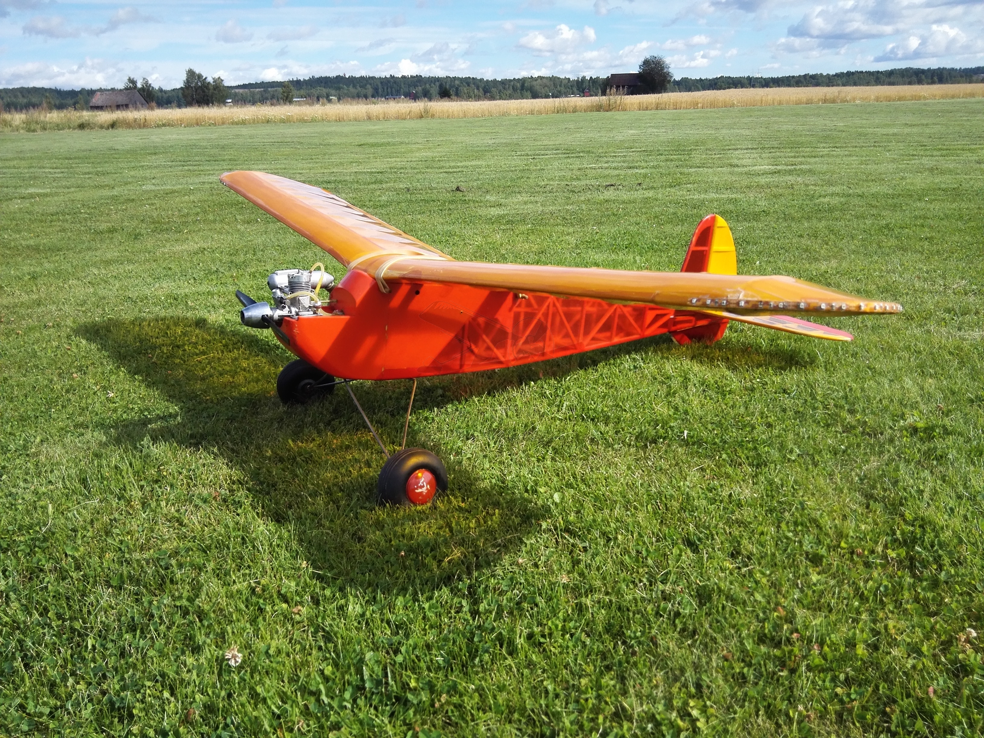 Vihdoinkin, kun pääsin maalle ja sain karistettua sanan varsinaisessa merkityksessä kaupungin pölyt jaloistaan, niin piste jiin päälle ja hyvälle viikonlopun aloitukselle, oli viskata Junnu taivaalle. Mikäpä olikaan kuunnella tyynessä Suomen suvi-illassa OS 30 FS -nelitahtimoottorin sulosointuista papatusta jollakin neljänneskaasulla tai jopa alle. Nyt tulikin ajettua heinäkuussa hankittua Junior 60" -old timeria kunnolla aivan tyynessä kelissä. Junnulla kruisailtiin vadelmamehun voimalla tosi pitkä lento; 41'34". Entisöintiä odottavalla Wara-Junnulla olen päässyt samalle hehtaarille. Junnutyyliin ajoin tietty tankin tyhjäksi ja parin minuutin kaartelun jälkeen kone tähdättiin laskuun pellon reunaa, ihan pihatien tuntumaan.