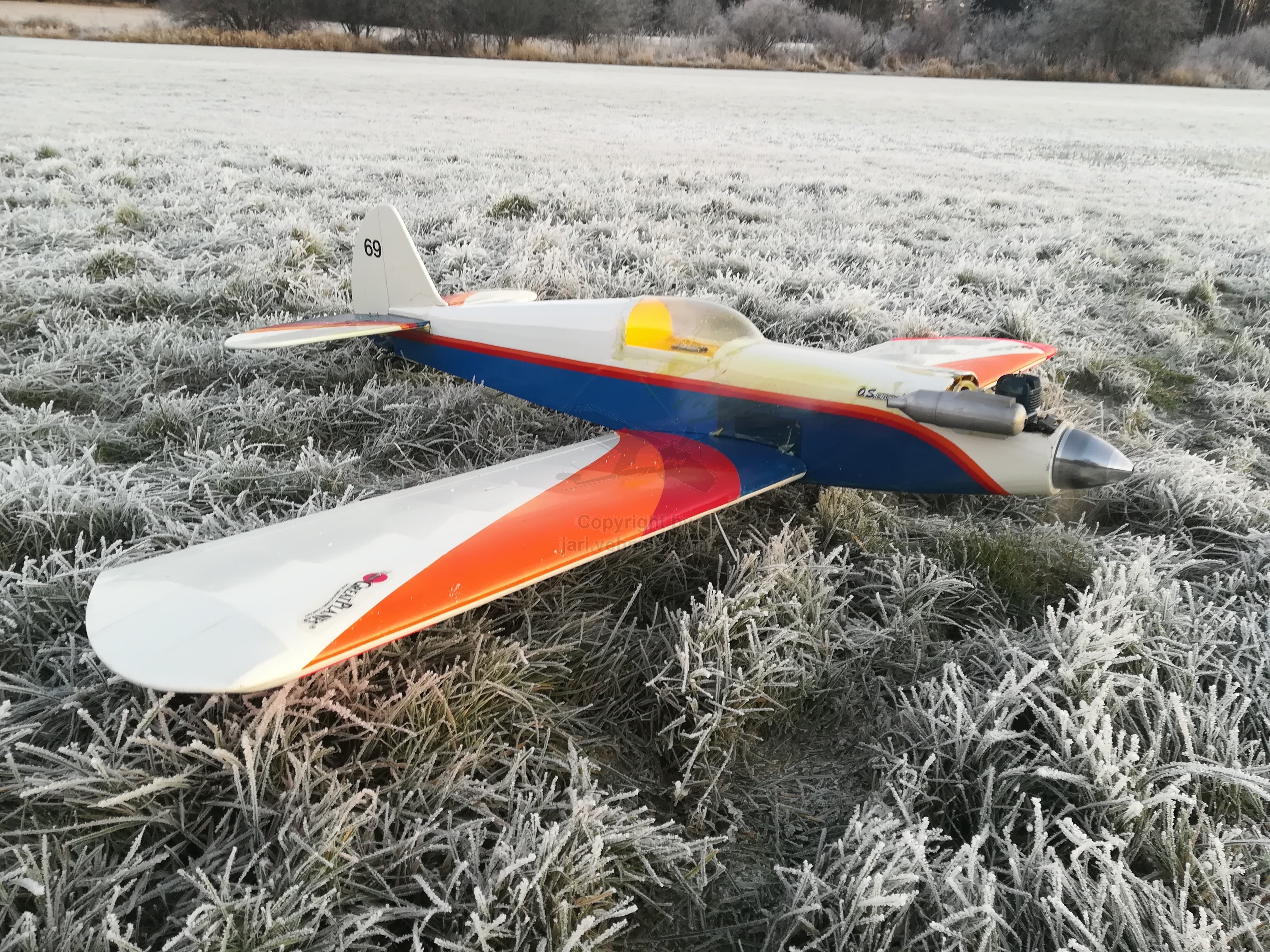 OS 46 LA lähti aika hyvin käyntiin vanhalla 10-kennoisella ja pian 10 vuotta vanhalla N-1700SCR -akkupakalla. Sitten vaan radiohuppu kaulaan ja kone kainaloon, niin lähdin tallustelemaan nurmikon toisen päähän. Avasin kaasun ja Sportti lähti nimensä mukaisesti nousukiitoon kuuraiselta nurmikolta, jonne jäi jäljet koneen noususta. Lentää kaahasi koneella ajastimen mukaisen seitsemän minuuttia, jonka jälkeen lähdettiin sorvaamaan laskua. Kone on helppo ottaa laskuun ja se oli kaunista katseltavaa, niin täydellisen onnistunut se oli. Päivä aloitettiin 7’26” mittaisella lennolla. Aamun toinen lento oli kutakuinkin ensimmäisen kattainen ja lentoajassa päästiin pari sekuntia pidemmälle. Pläkätyynessä kelissä hallitut laskut eivät voi olla muuta kuin onnistuneita.