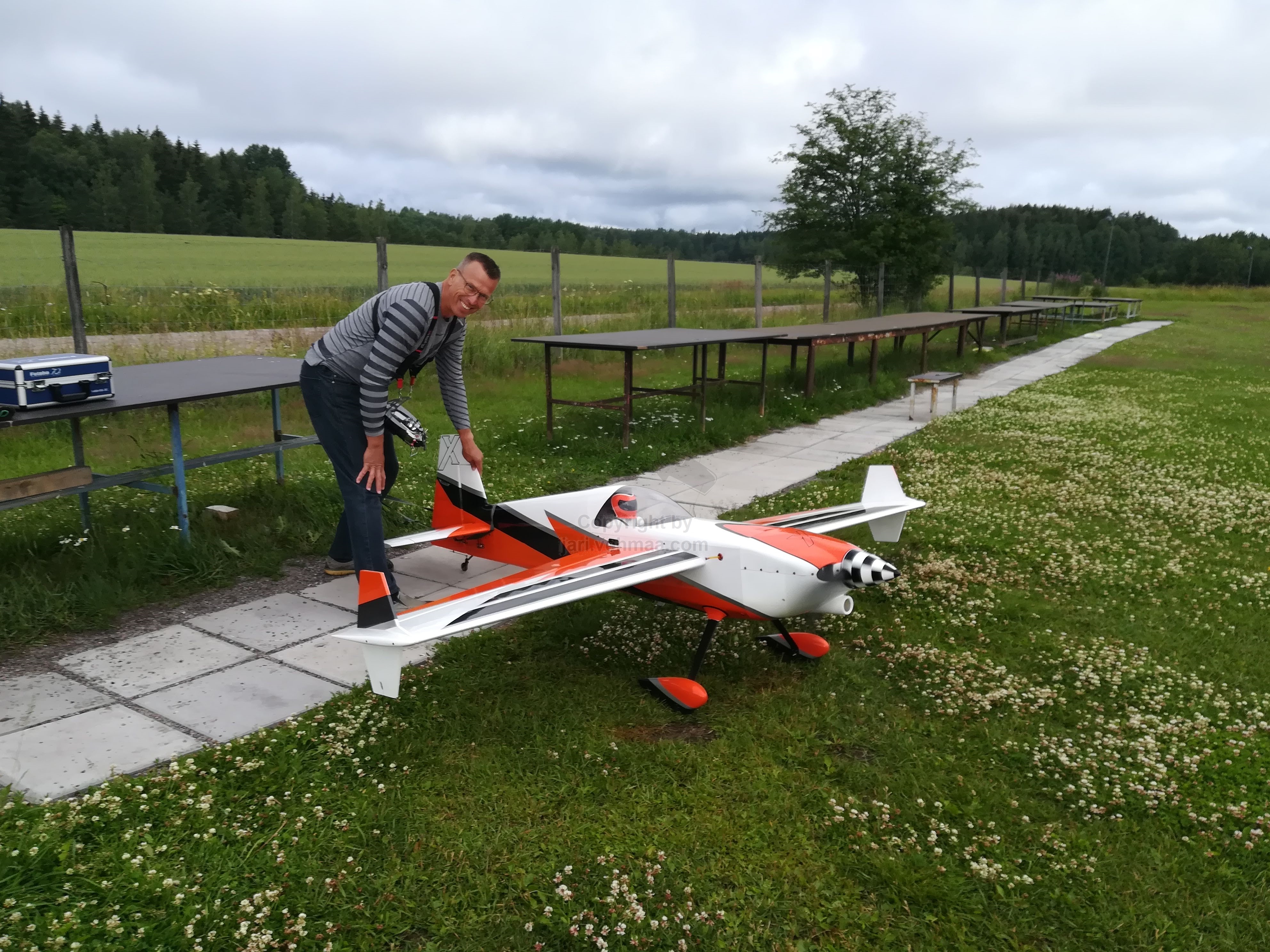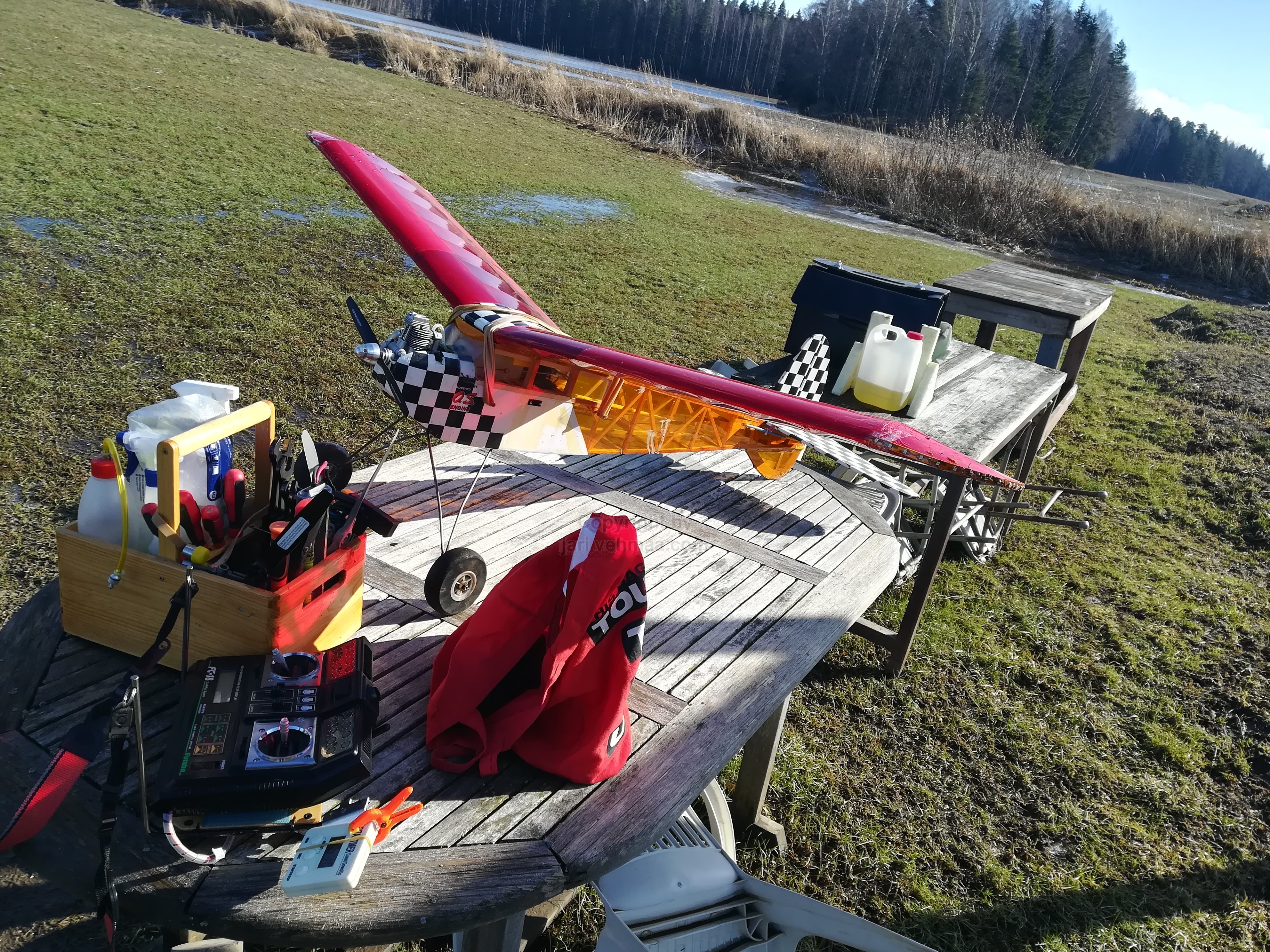 Olin kentällä aikalailla yhdeksän jälkeen, mutta en kuitenkaan ollut ensimmäinen, mikä vähän yllätti. Ilma oli ihan täydellinen; siis pläkä. Ainoa miinus oli päin näköä paistava aurinko. Tämän koneen keulilla olevan OS 46 ei käynnisty ihan yhtä herkästi, mitä toisen yksilön OS 46 LA. Koneen käynnistyksessä erillinen ständi olisi poikaa, sillä moottorin käydessä pitää olla tarkkana, ettei kone hyökkää syliin, kun se on starttipöydällä ainoastaan renkaiden varassa.
