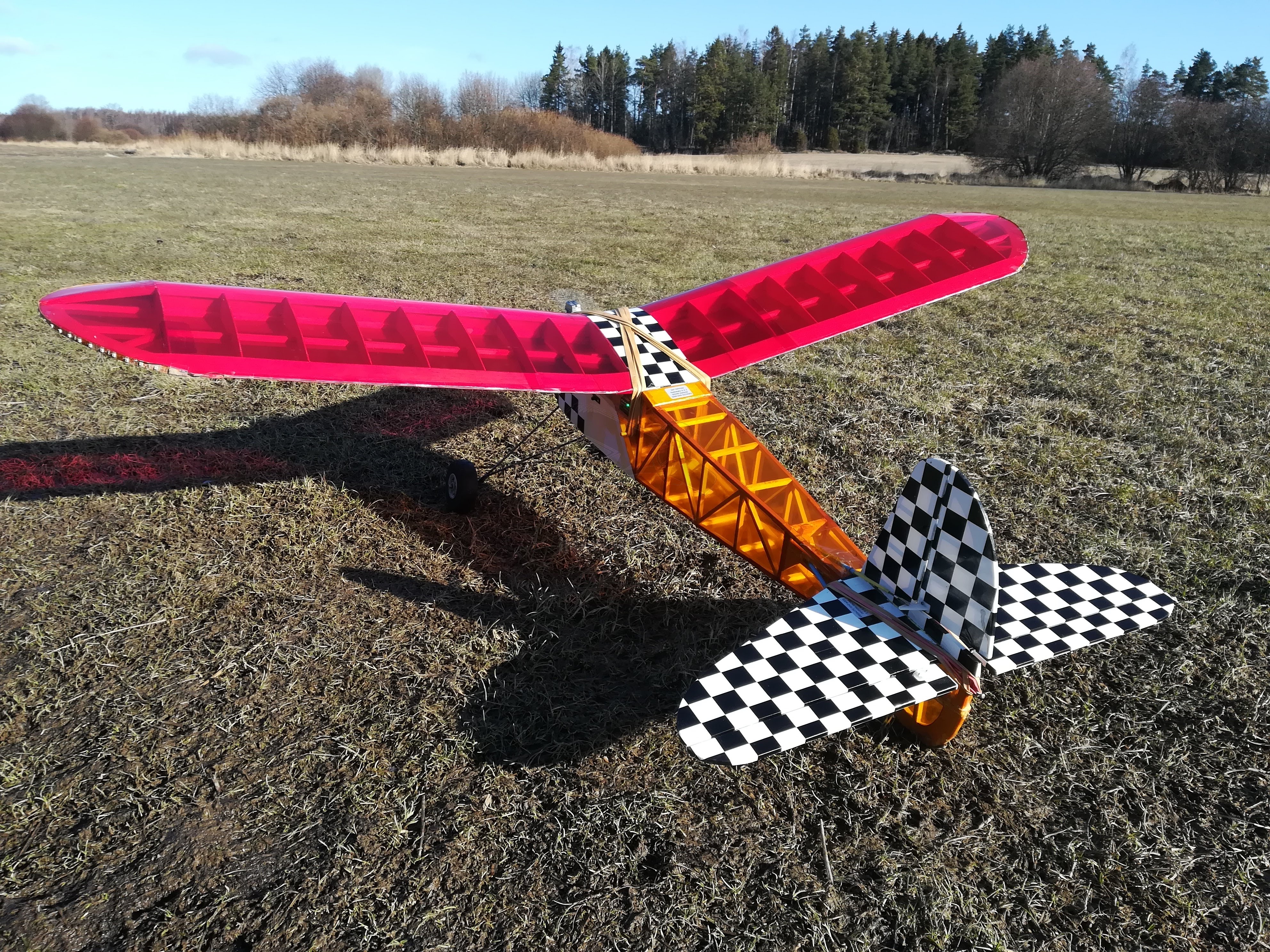 Mutta palataanpa taas asiaan. Super Sportti lähti kauniiseen nousukiitoon aavistuksen rikkaalla moottorin käynnillä. Asiaan kuului pienoinen jännitys, mutta ihan turhaan, sillä kone toimi ilmassa varsin suoraviivaisesti, niin kuin arf-koneen kuuluukin toimia. Koelennon pituudeksi tuli 4’31” ja lasku oli näkki, kuten pitääkin olla. Trimmasin ilmassa ainoastaan siivekettä aavistuksen verran, muutoin kone lensi hienosti edellisen yksilön setupilla.