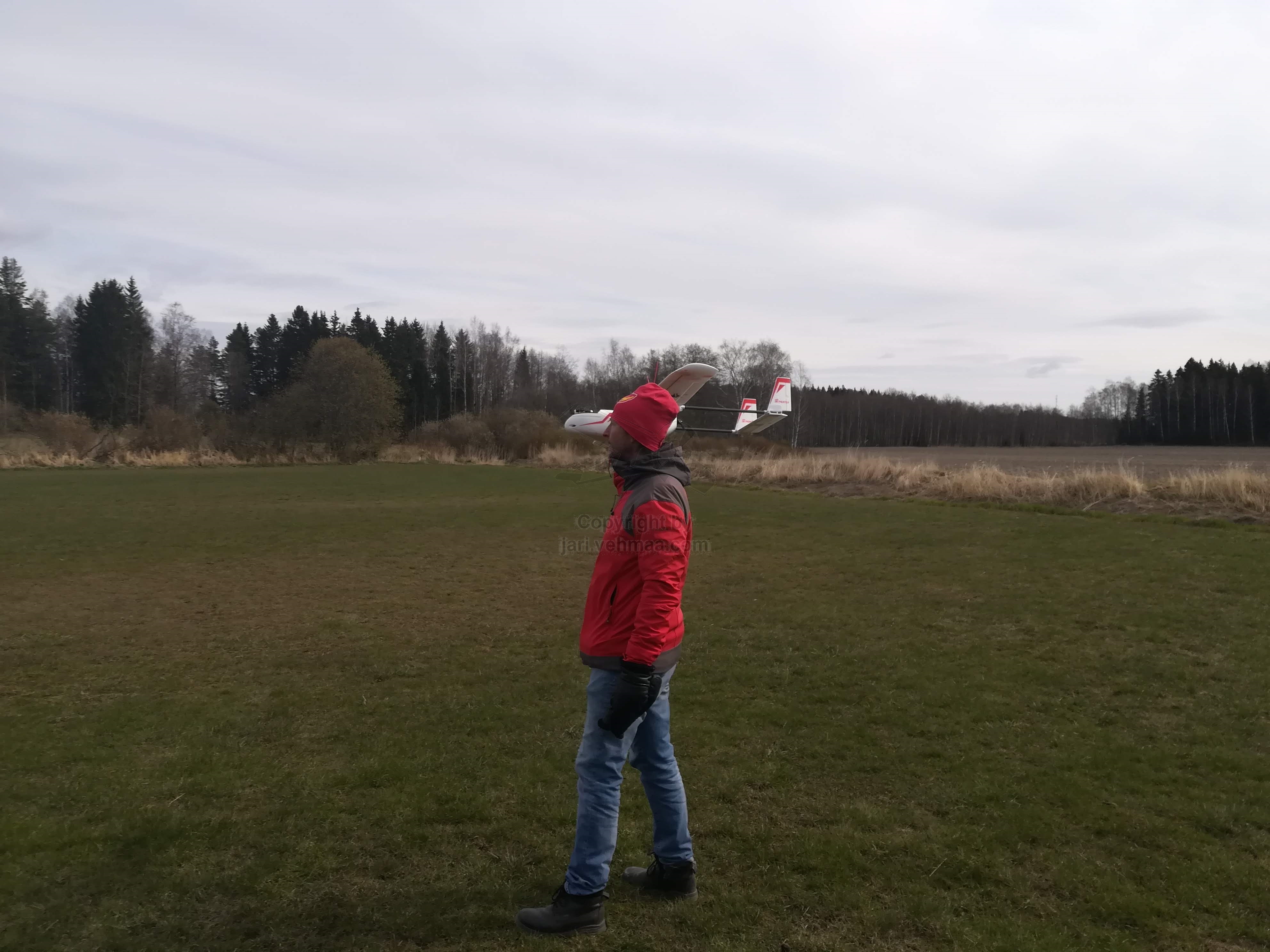 Pasi oli raportoinut ihan kelvollisesta kelistä jo aiemmin aamulla. Pasin lisäksi paikalla oli Mika tutuksi tulleiden härpäkkeittensä kanssa. Sää oli varsin kelvollinen; kaunis ja aurinkoinen, joskin tuulta oli ihan kohtalaisesti. Valmistelin Junnun lentoon ja lensin ens’ alkuun ihan lyhyen, vain 7’13” kestäneen lennon, että muillakin olisi vapaata ilmatilaa.
