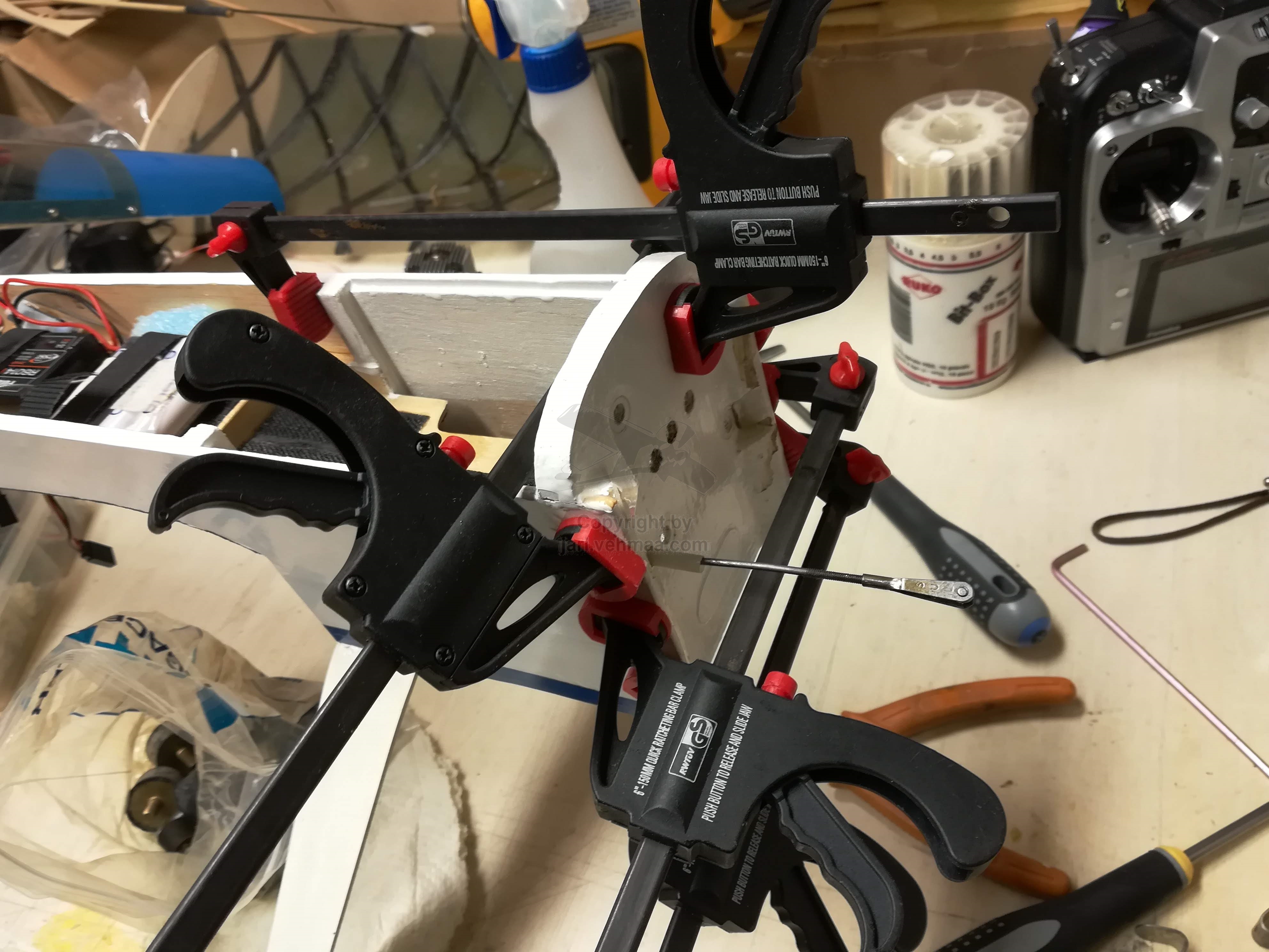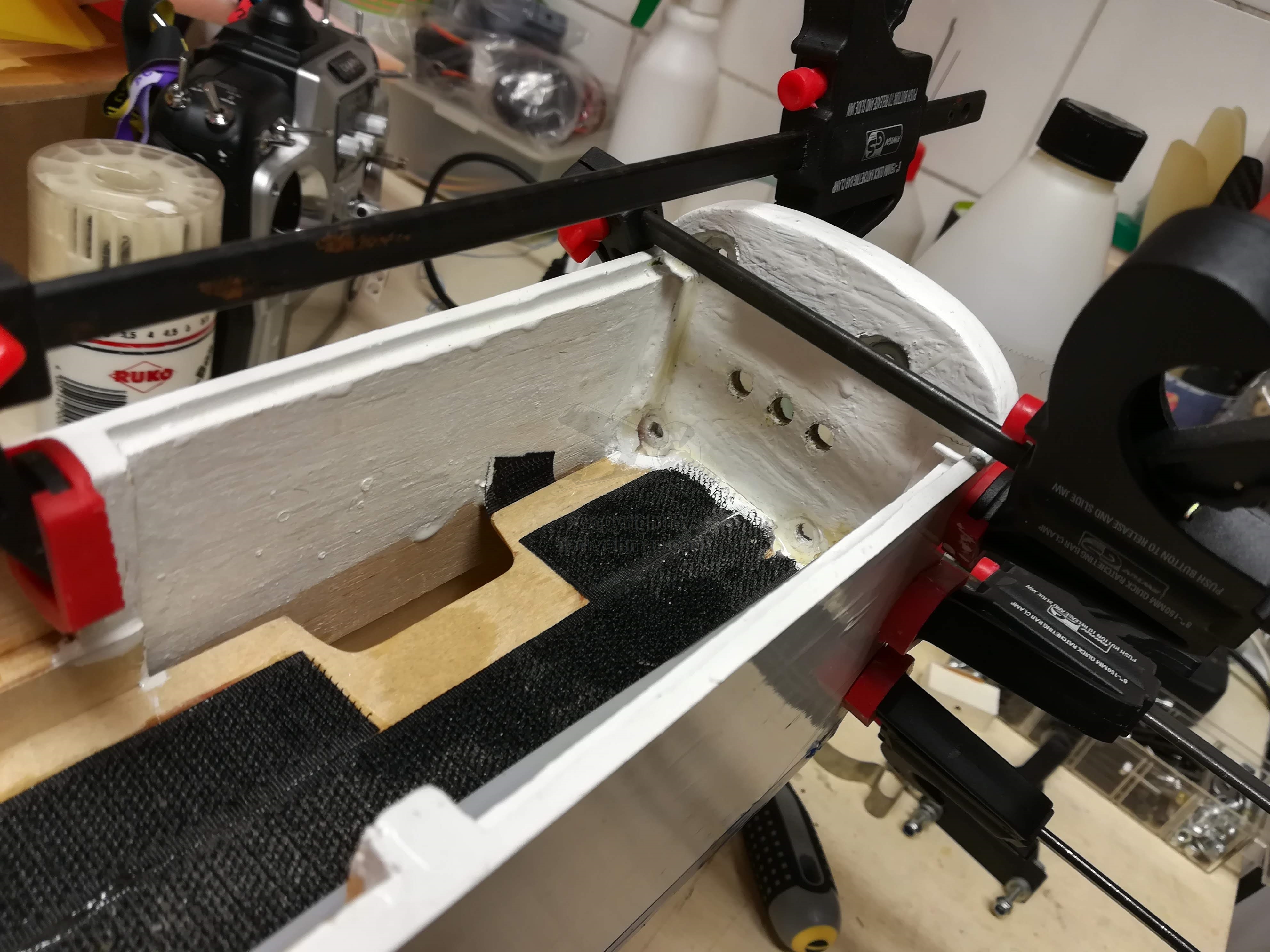 Epp-Yakin siivekeservon koloon oli liimattu hieman hötövaneria niin, että servon kiinnitysruuvilla oli kerrankin jotain, mihin kiinnittyä, kun ruuvi ei ota kunnolla kiinni ilmaan, styroxin sijaan. Sunnuntaiaamu maalla oli sadetta enteilevän harmaa ja täysin tyyni, ruoho oli märkään yöllisen sateen jäljiltä. Hetken mietin, että roiskuuko laskuissa kosteus säätimeen tai vastaanottimeen, vaan enpä miettinyt kauaakaan.