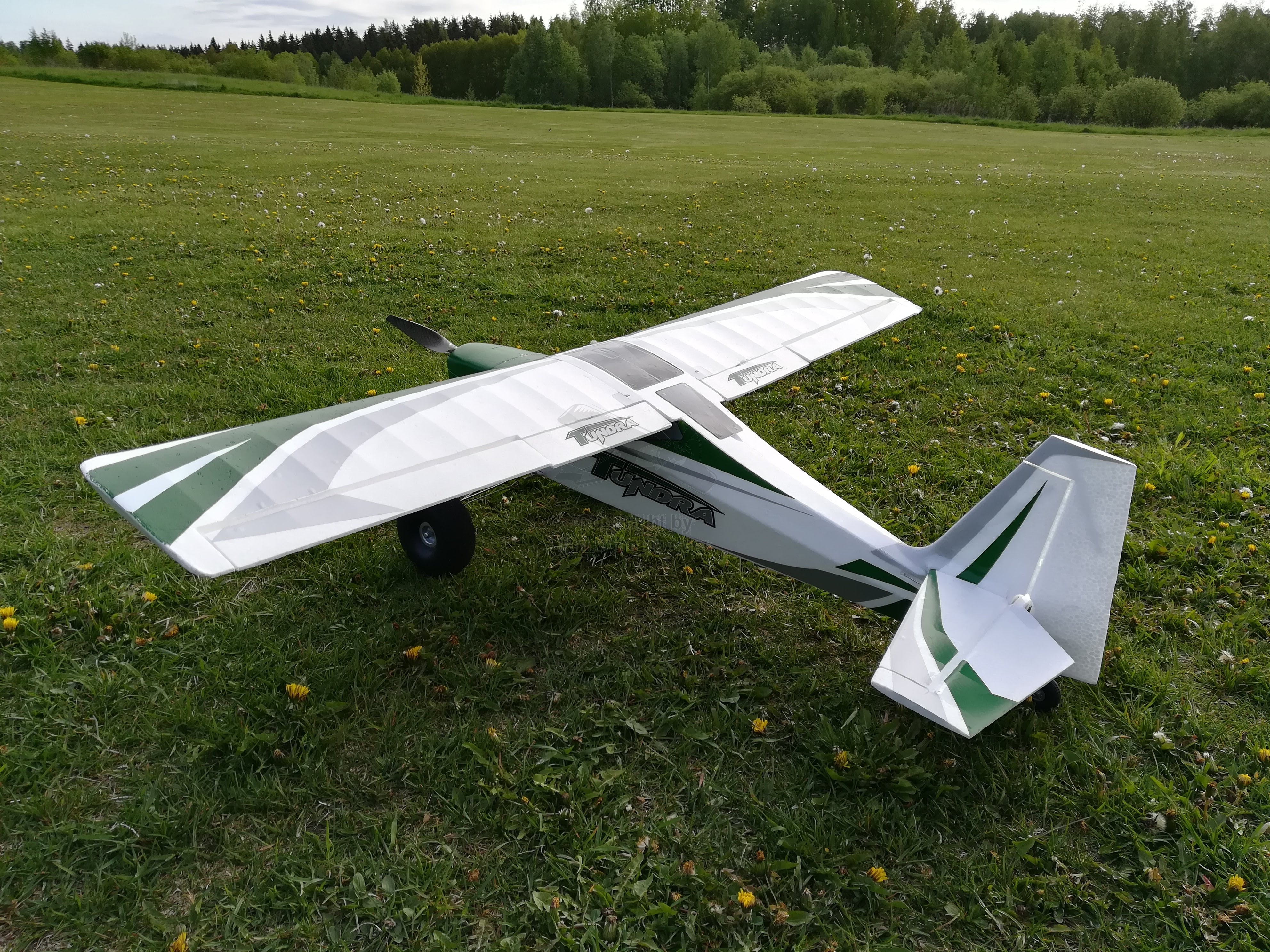 Ilmassa kone oli yhtä pedantti ja helppo ajettava. Siivekkeet ovat kyllä herkät ja isoilla liikkeillä vaakakierteet ovat järkyttävän nopeita. Kova puuskainen tuuli, nopea kone uudella, hieman lyhyellä lentokentällä ei ole ihan paras mahdollinen yhdistelmä. Päätin ottaa koneen laskuun ennen kuin kuuden minuutin ajastin oli edes lähelläkään piippaamistaan. Laskuun tulin ison tien suunnasta. Aika pian lähestymisen yhteydessä tajusin, että moottori kävi vielä liian isoilla kierroksilla laskuun nähden, eikä moottori suostunut sammumaan radiosta käsin. Eipä tässä tilanteessa auttanut muu, kuin tulla kylmän rauhallisesti laskuun moottorin käydessä liikaa. Vaikka kenttä loppuikin kesken, niin onneksi pellon vastainen heinäpöheikkö pysäytti koneen ja sammutti moottorin. Tankkasin koneen hetken päästä uudelleen ja käyttelin ja säätelin moottoria ja naputtelin radiohin throtle cut:in, mikä toimi hyvin. Tuuli oli kuitenkin sen verran oikukas, etten tänään lentänyt sen enempää.