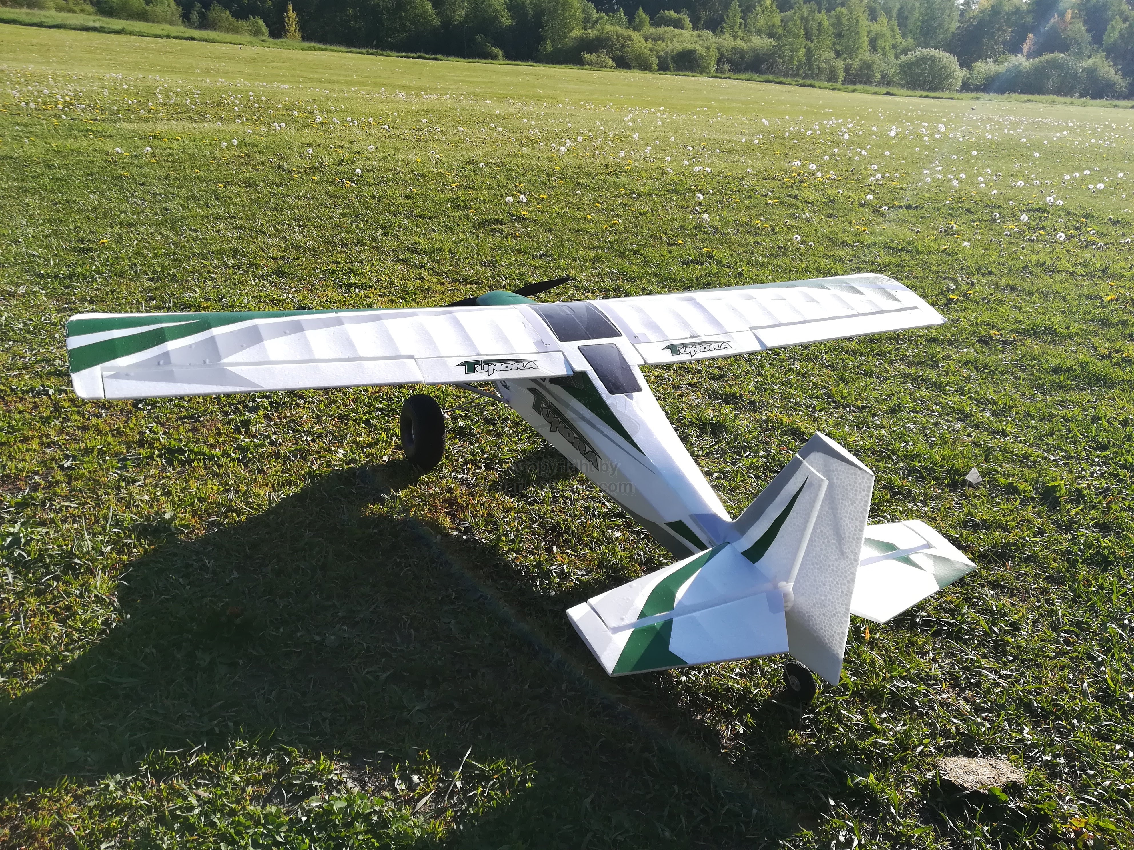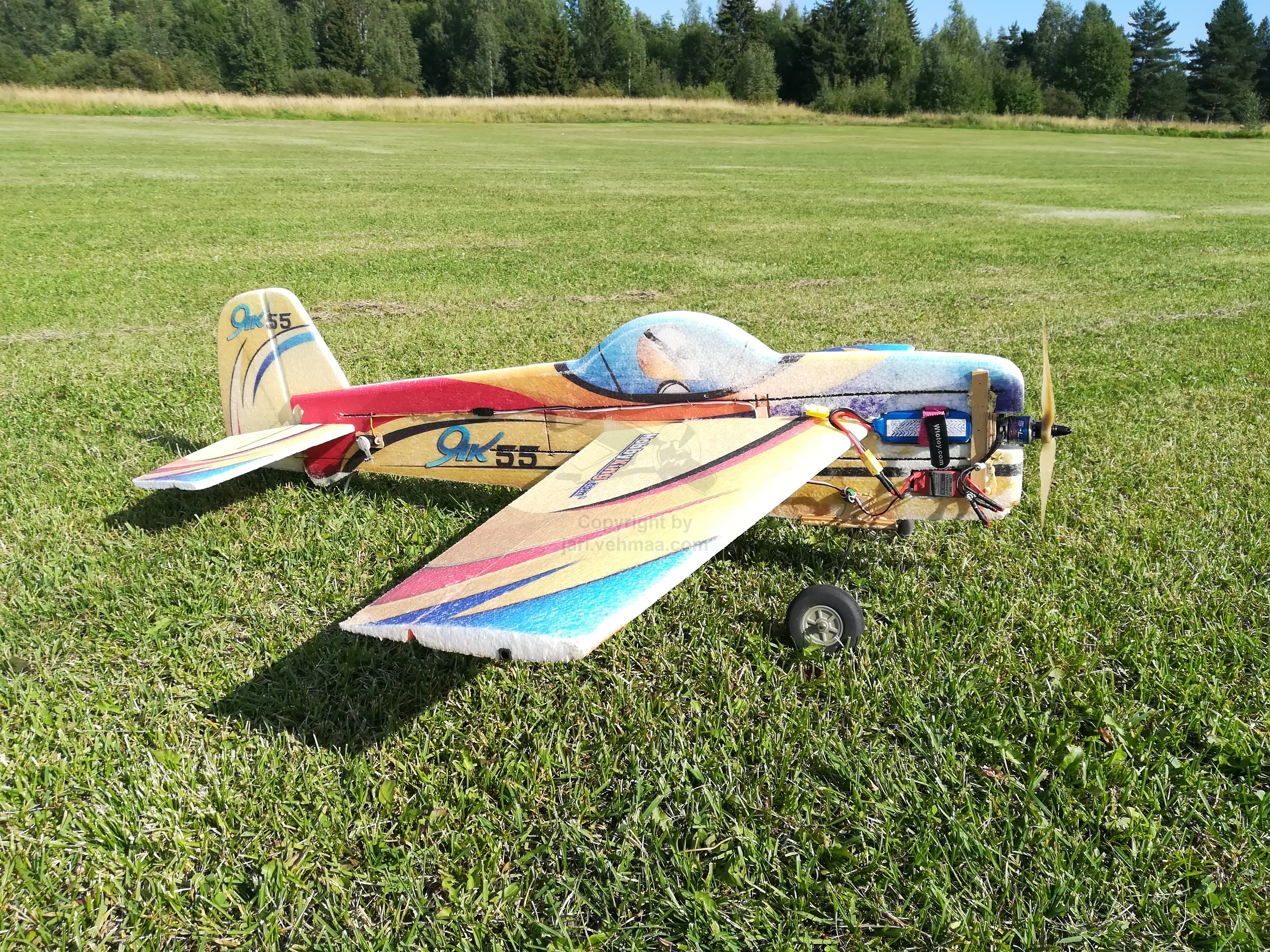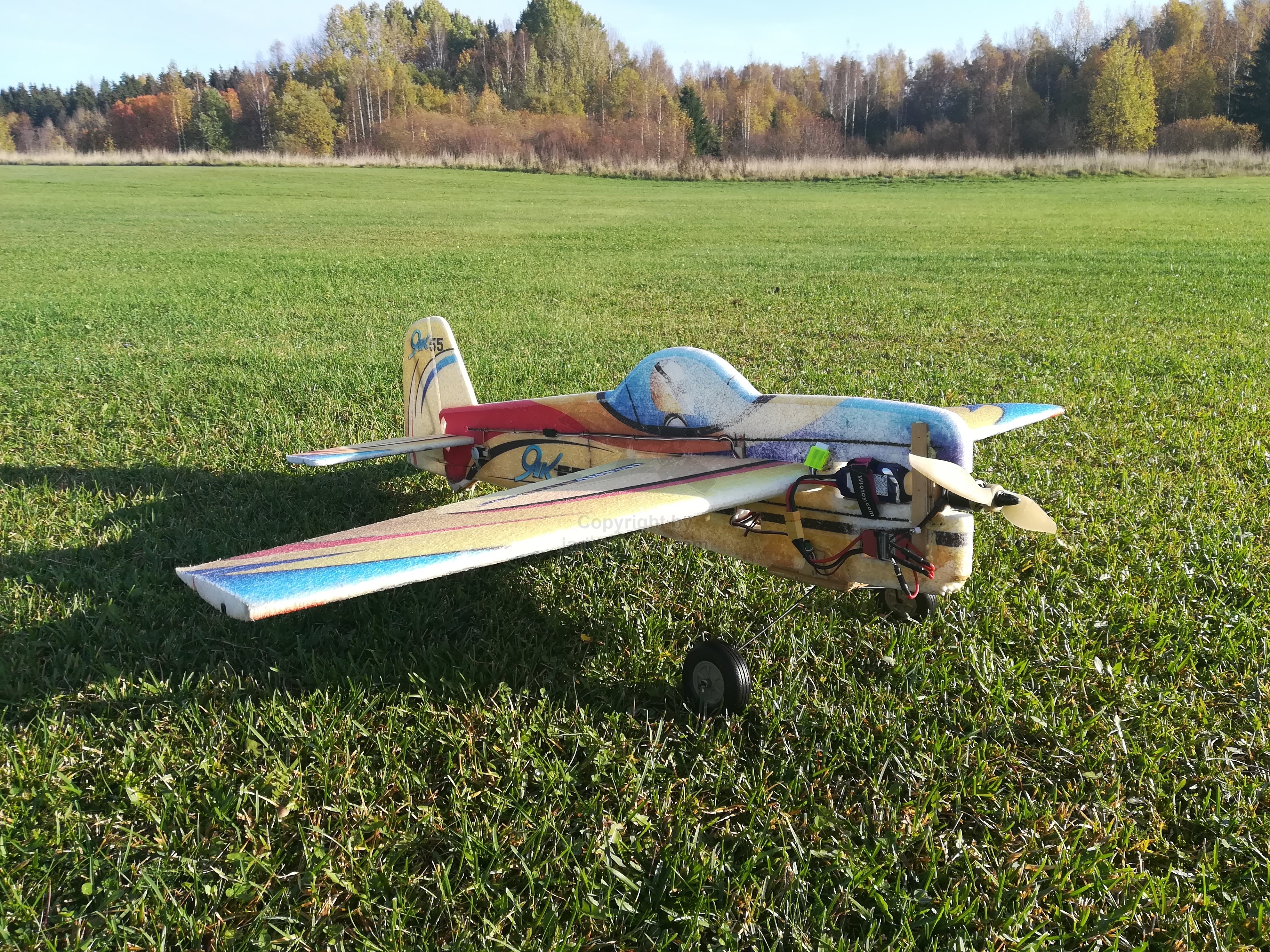 Akkukaluston varaustilanne oli sen reilun viikon takaa. OS lähti hienosti käyntiin. Moottori vaikutti ekassa nousuyrityksessä tosi laiskalta ja niinpä nurmikko oli loppua kesken, eikä kone ollut vielä edes ilmassa. Kone pysähtyi kentän reunan heiniin moottorin jäädessä käyntiin. Ennen seuraavaa yritystä, säädin moottoria laihemmalle, nyt siinä oli vetoa tuttuun malliin. Junnu lähti hienosti lentoon.