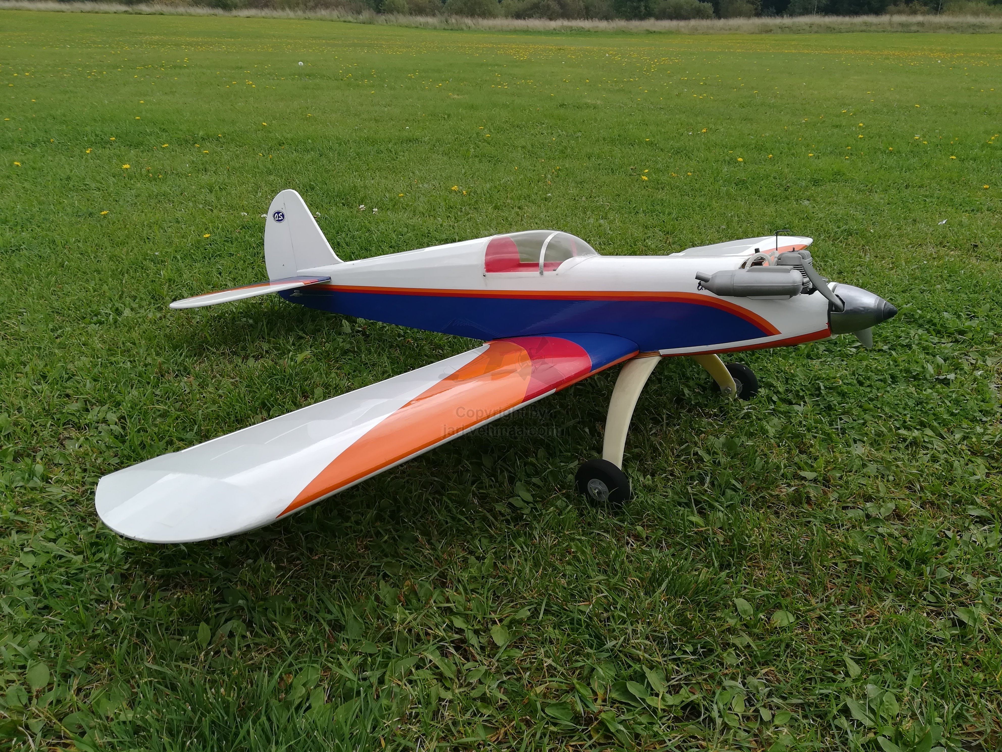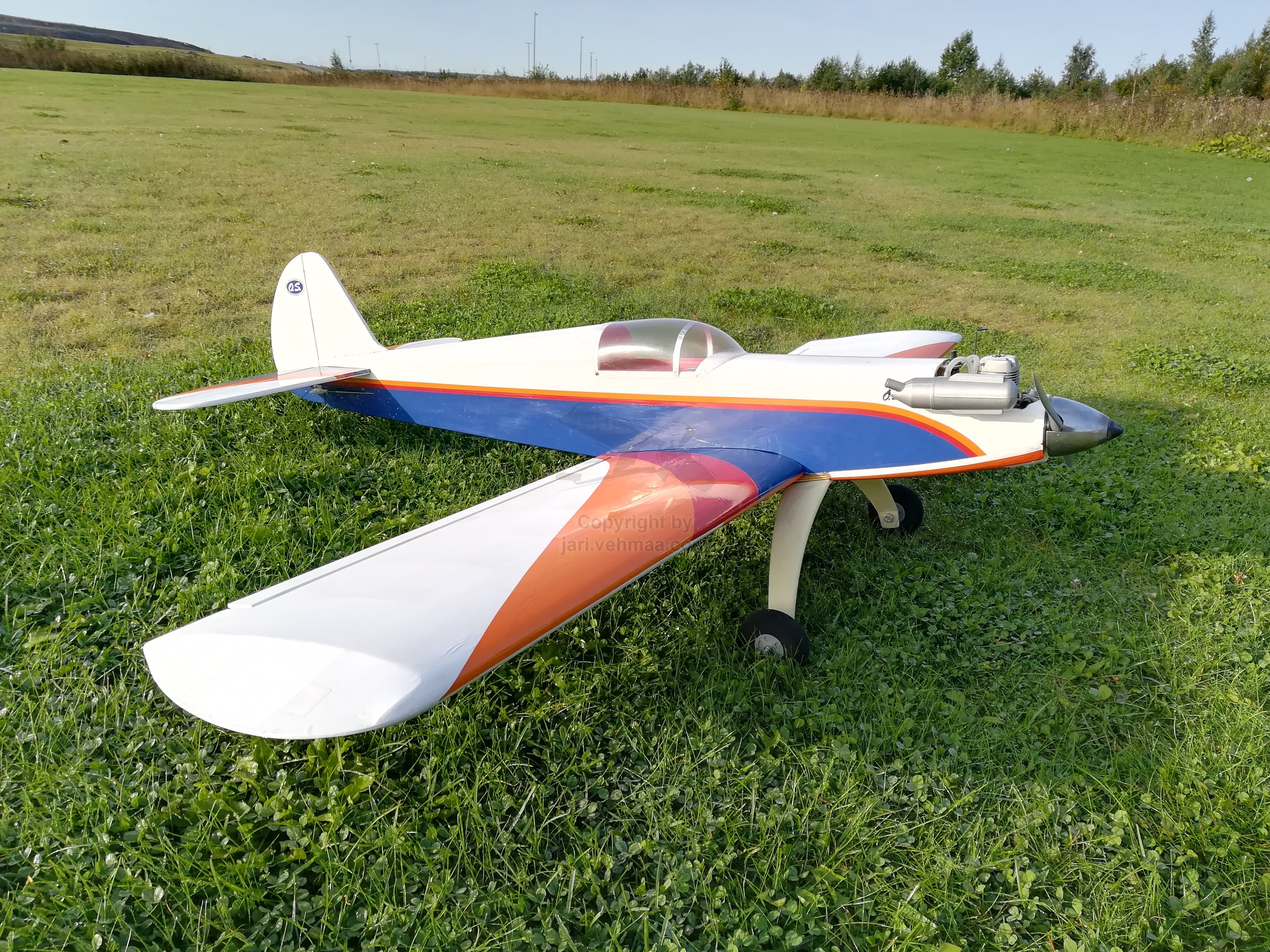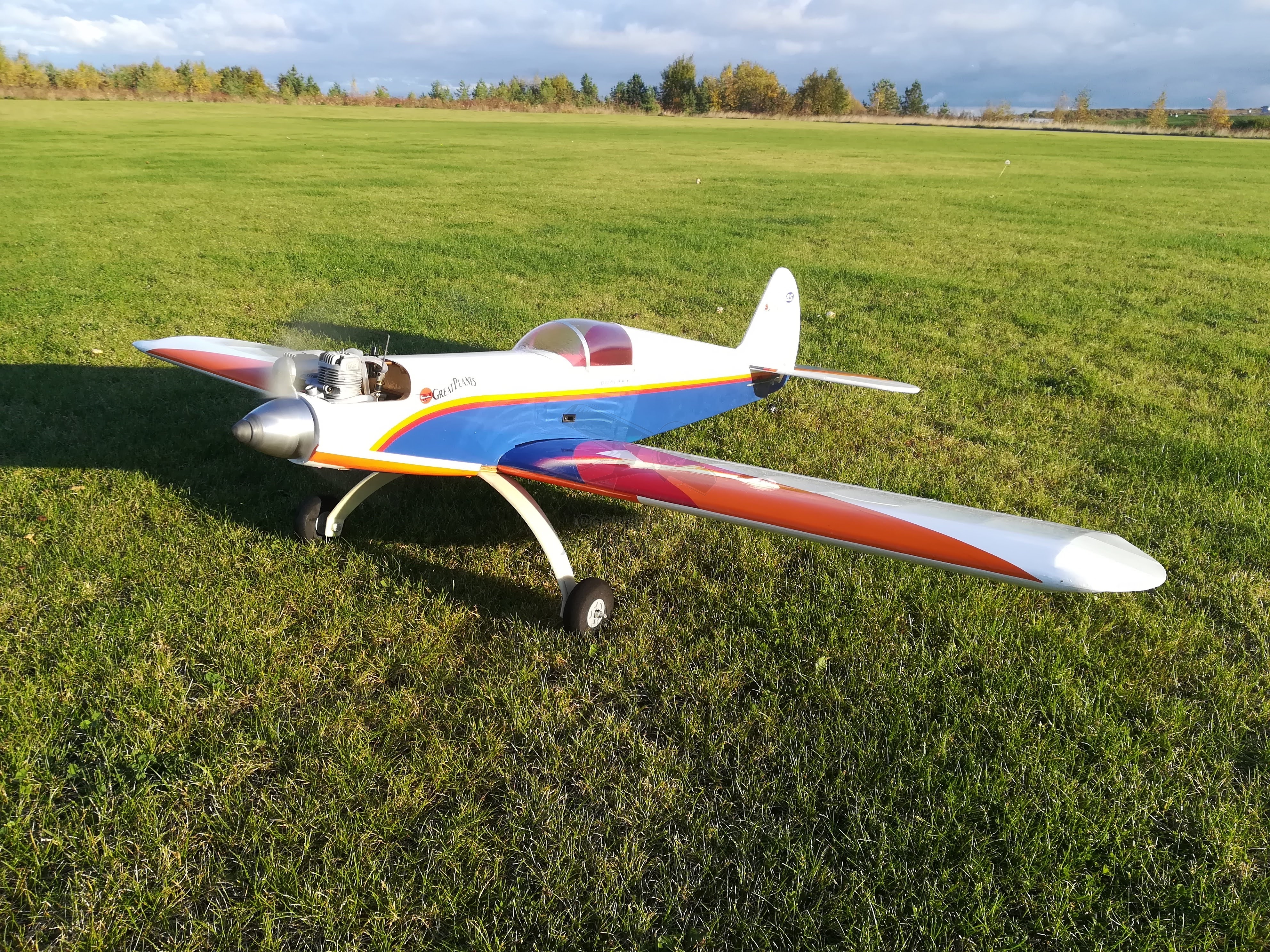 Epp-Yak oli ollut välinehuollossa edellisen lennätyksen jäljiltä, missä kone kopsahti tonttiin liian matalalla pelleilyn seurauksena. Onneksi koneeseen ei tullut sen isompaa korjattavaa. Ajelin siis Petikkoon. Paikan päällä oli Kaarlo, jota en ole nähnyt pariin kolmeen vuoteen. Hänellä oli kohtalaisen iso bensa-Yak, jossa oli joku 60 ccm DLE-moottori.