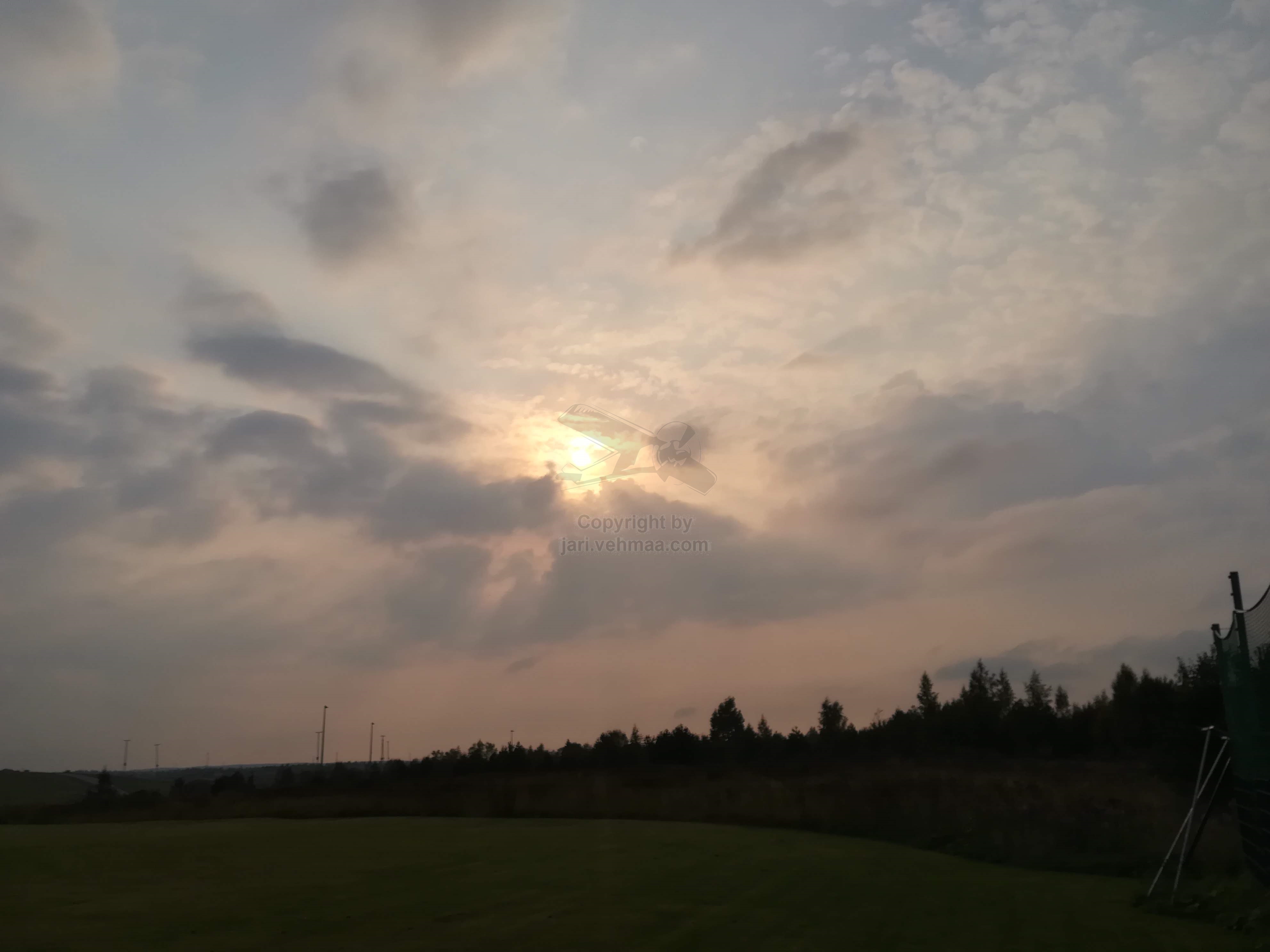 Kahden ensimmäisen lennon aikana taivas oli aika pilvinen, mutta ei kuitenkaan synkkä, vaan sellaista normaalia aamupilvisyyttä, jonka aurinko ajaa tiehensä, kunhan pääsee ensin nousemaan. Tuulenvire on aika pieni ja merkityksetön. Näin hienossa ja kauniissa kelissä lensin kolme akkua tyhjiksi kokonaistiiman ollessa 20’ 22”. viimeisen lennon aikana aurinko pääsi jo pilkistämään pilvien lomasta. Päivän tiima/akku: 8’00” Zippy 4000mAh#2; 6’19” Turnigy 3000mAh#1 ja 6’03” Turnigy 3000mAh#2.