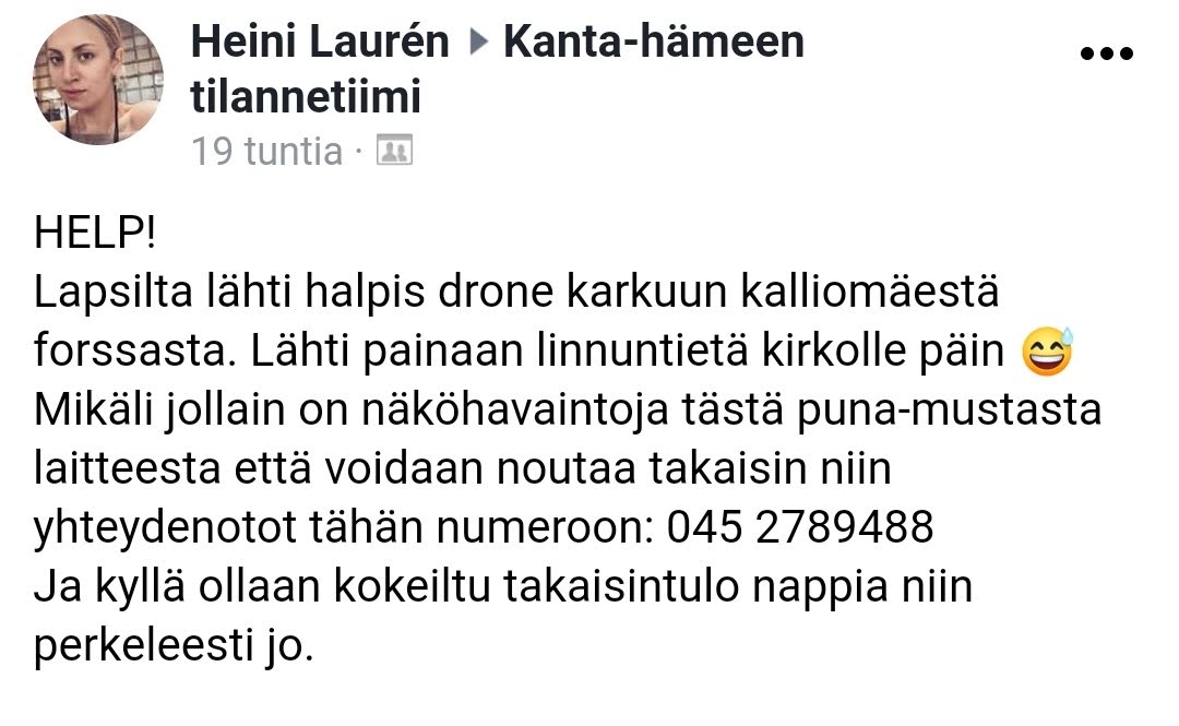 Jonkun drone pellen lelu on kadonnut. Vastuuttomien toheloiden hukkaamia droneja ilmoitellaan kdonneeksi aina silloin tällöin Forssan ja Kanta-Hämeen tilannetiimeissä.