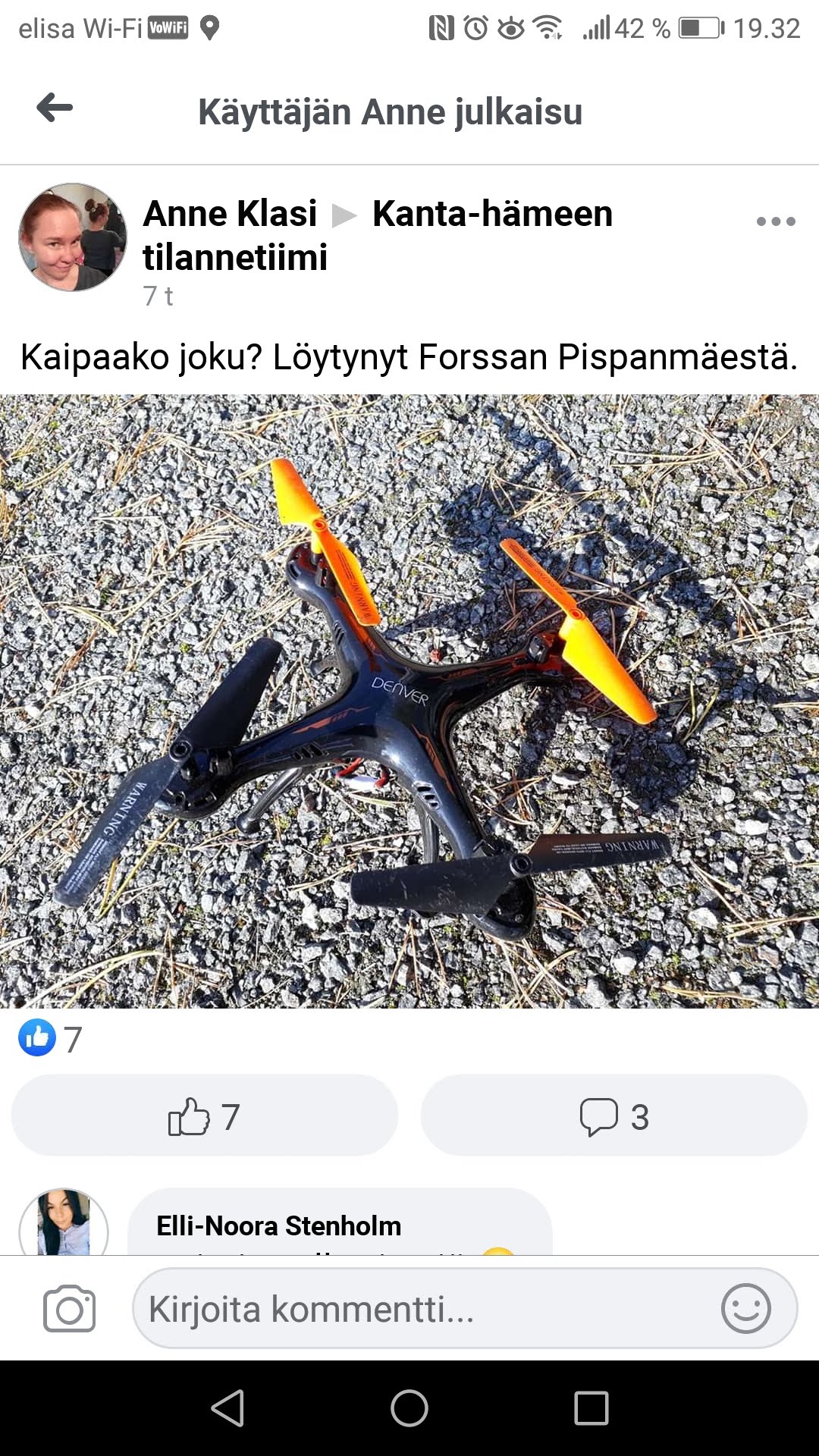 Jonkun drone pellen lelu on löytynyt. Vastuuttomien toheloiden hukkaamia droneja ilmoitellaan löytyneeksi aina silloin tällöin Forssan ja Kanta-Hämeen tilannetiimeissä.